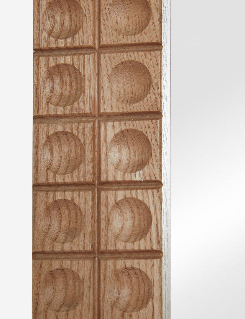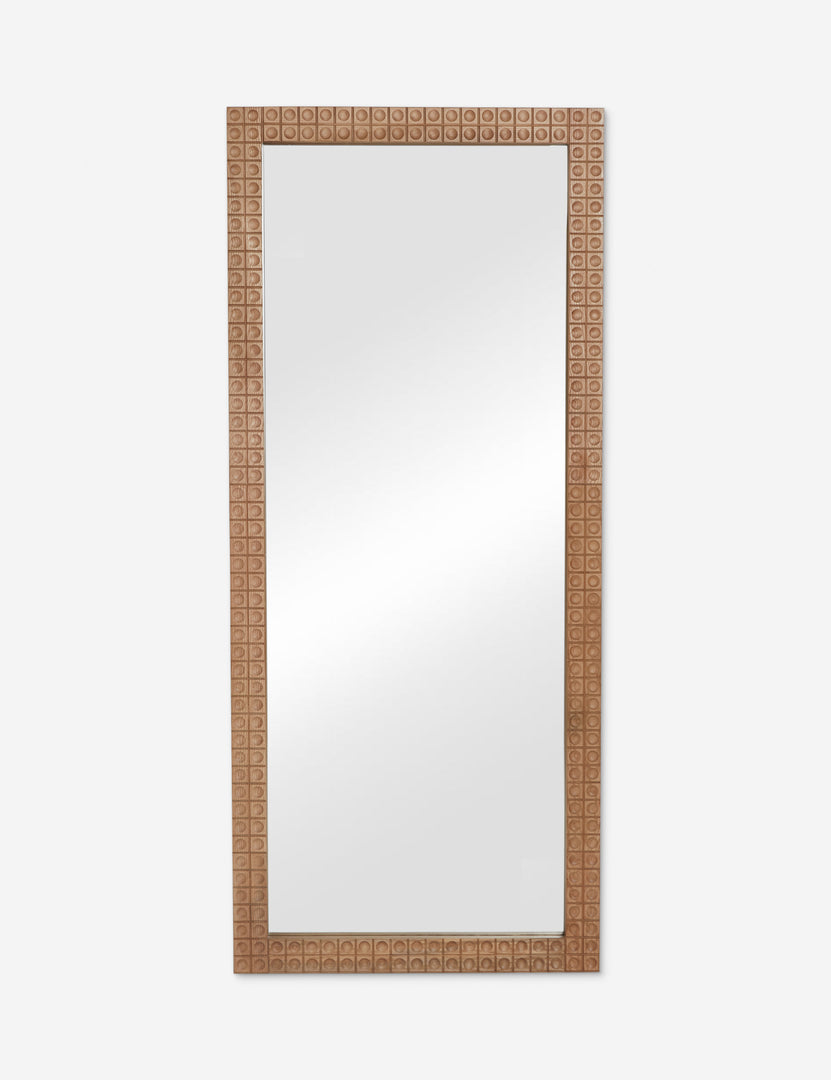 A motif of round indents brings texture and depth to this framed mirror. The full-length mirror design is rich and warm with its handcrafted wood frame, offering casual elegance in your living or dining room.