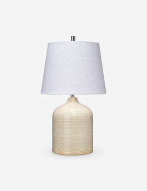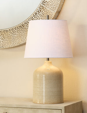 The Fiametta lamp offers soft impact with a neutral ceramic base featuring subtle ribbing. A rolled-edge linen shade and metal finial complete the look for a quiet yet polished finish. We love this table lamp for grounding a home office or warming a cozy corner.