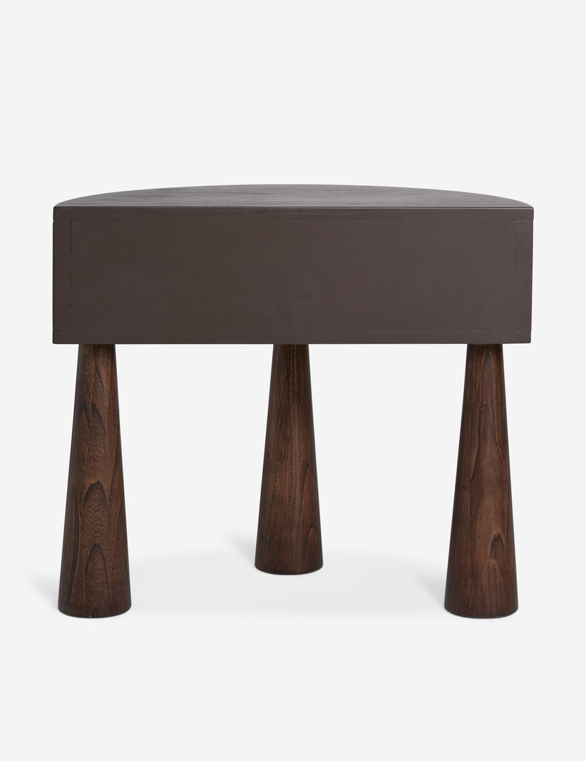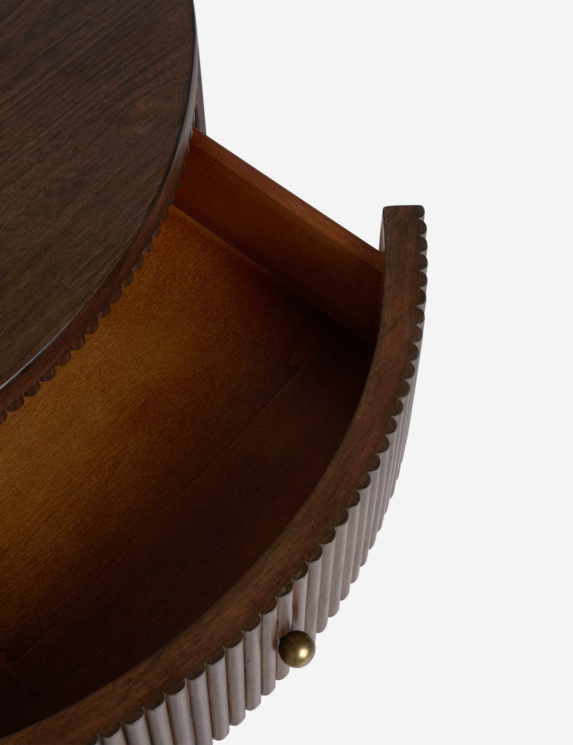 Natural grain texture takes a sculptural turn in our Fletcher nightstand. The modern silhouette is defined by its chunky tapered legs and a crescent-shaped top with fluting along the sides. This wood nightstand strikes an artful poise at your bedside—with a single drawer for the perfect touch of storage.