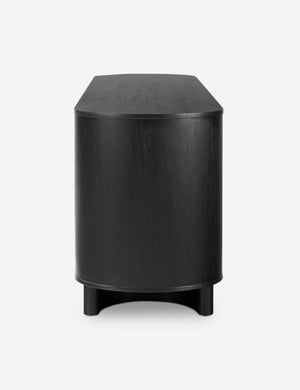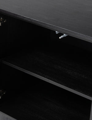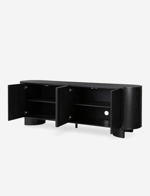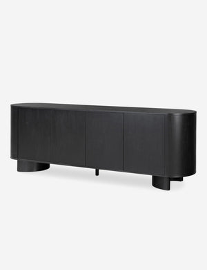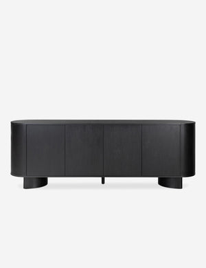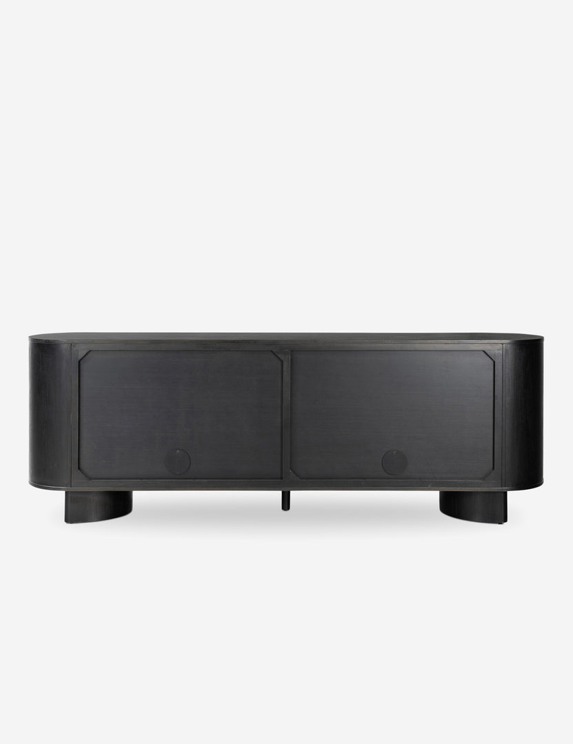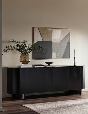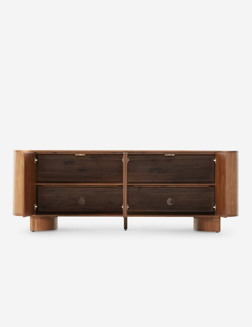Clad in acacia, the soft lines of the Gilda sideboard are reflected in the curved feet, offering a sturdy design with a gently rounded profile that feels sculptural yet grounded. This sideboard cabinet features four push latch doors, providing ample storage for dishes, linens, and other essentials.
