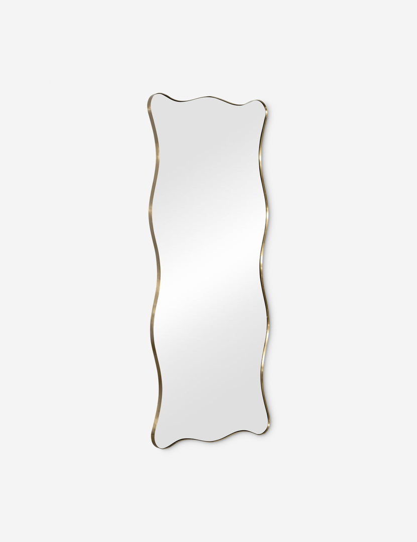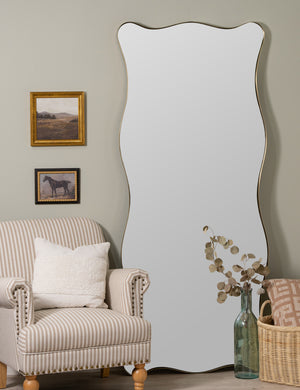 With its soft curves and slim gold frame, the Halberg mirror brings a sculptural elegance to your space. The floor-length silhouette makes a striking impression, whether leaned or mounted to reflect light. We love this modern floor mirror for transitional spaces where chic details enhance a timeless aesthetic.