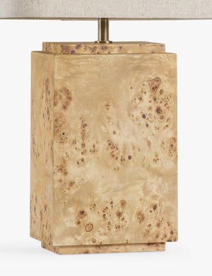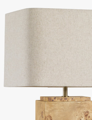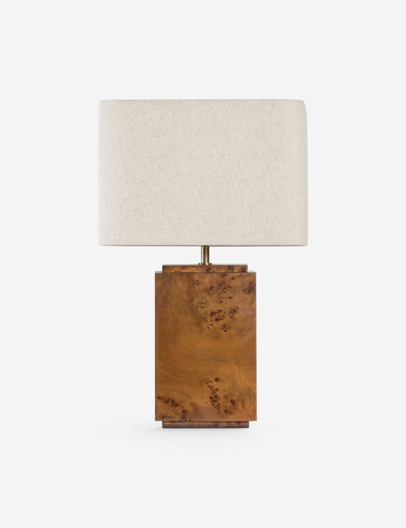 Bring a polished finish to your lighting design with this burl wood table lamp. The clean-lined base is topped with a squared linen shade featuring gently rounded corners to soften its silhouette. We love this lamp for layering luxe texture and light into a curated space.