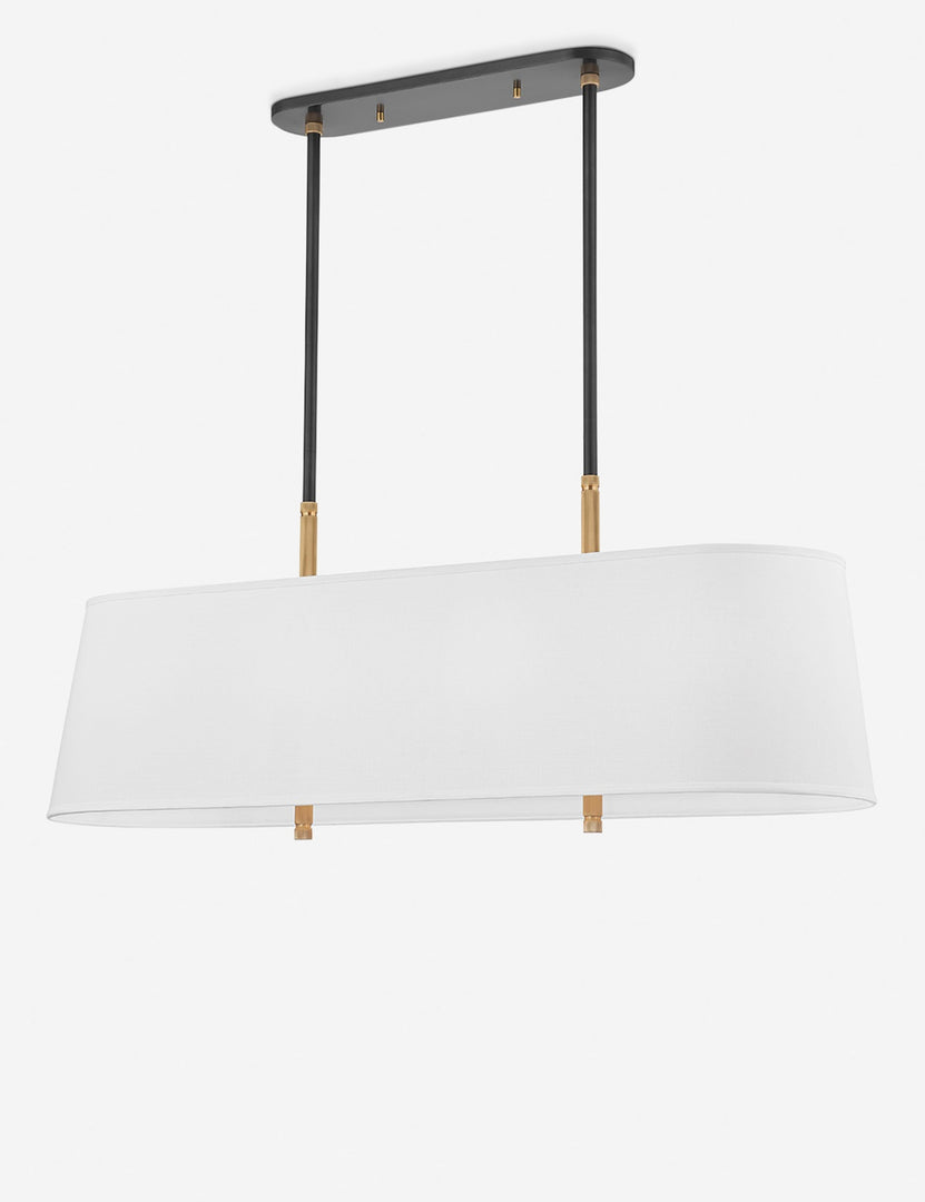This chandelier offers a ceiling fixture with a clean and simple silhouette filled with textural details like ridged accent pieces and tidy knurling. Finished in antique bronze paired with brass accents and contrasted with a white Belgian linen shade to offer brilliant overhead lighting for a dining room or living space.