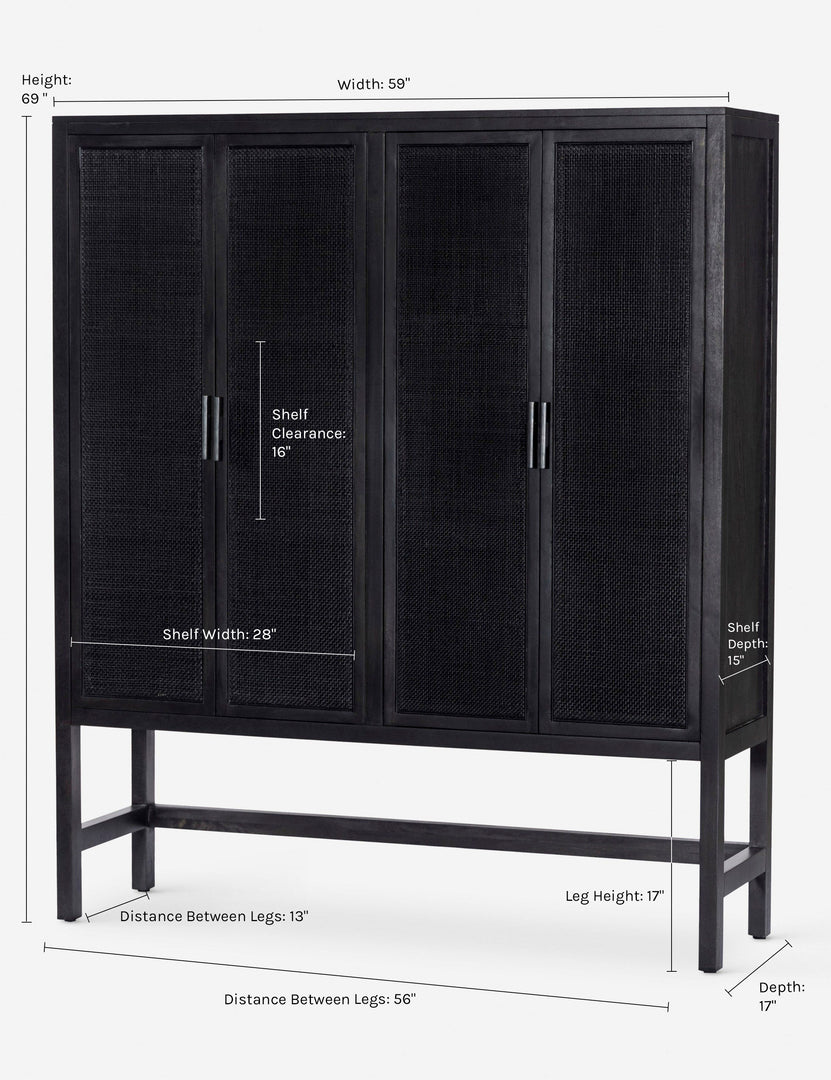 Clean lines and an airy profile bring a cool coastal feel to the Hannah cabinet. We love the classic touch of the woven cane front for its natural texture and warmth. This cabinet features two sets of doors with shelving inside—stylishly spacious storage for a bedroom or dining area.