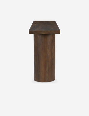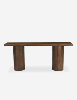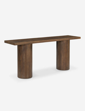 The Herrero console table highlights clean geometry and the natural warmth of reclaimed wood. With its long, minimalist profile and rounded column legs, this console table offers a refined balance of shape and scale. Style it behind a sofa or in a hallway for an elegant, architectural touch.