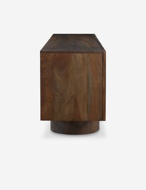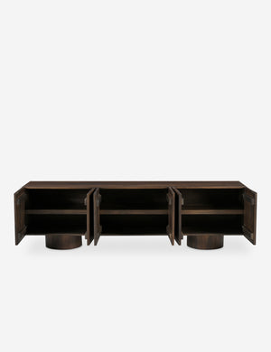 The Herrero media console highlights clean geometry and the natural warmth of reclaimed wood. This large-scale storage piece pairs a broad top and column-style legs with six paneled doors and rear cutouts for cable management. Use it as a streamlined storage solution in your family room or lounge.