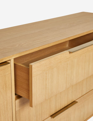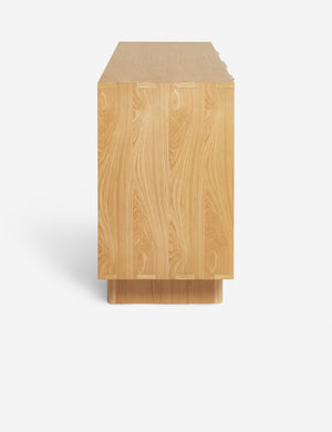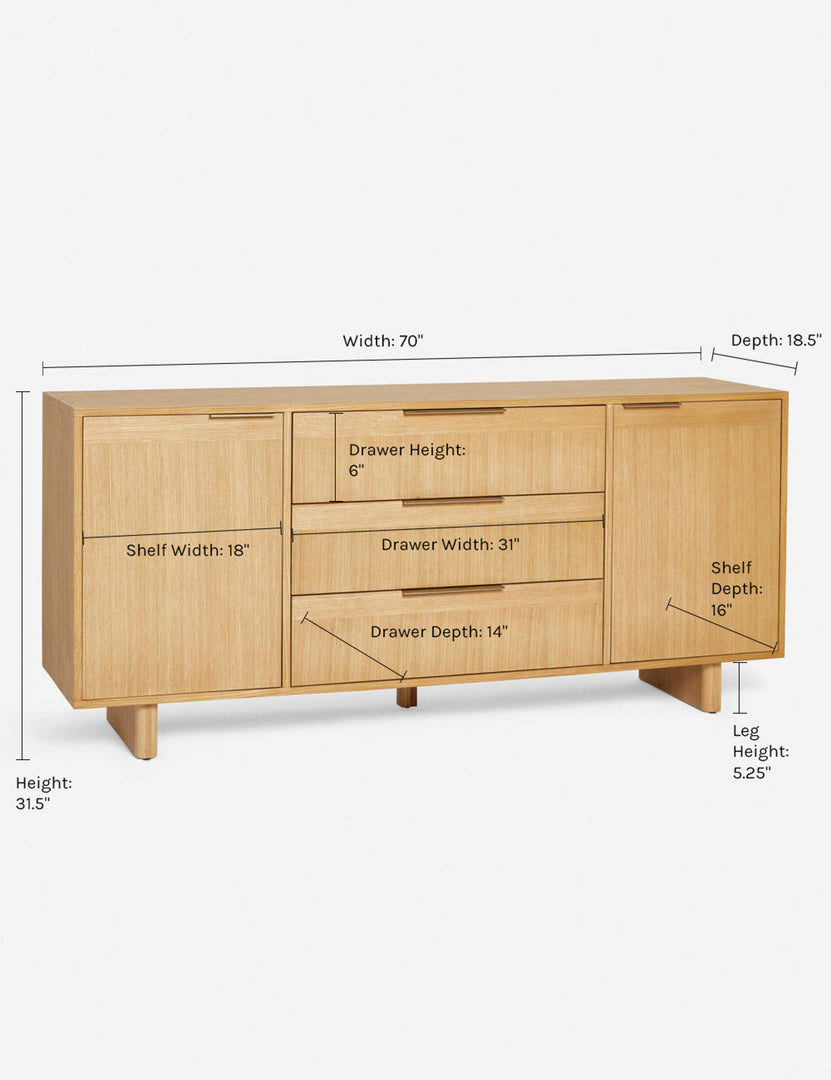 Our Hillard sideboard features the collection's signature clean line design lifted off the ground with rounded legs to offer balanced modern appeal. The white oak veneer creates beautifully contrasting grains finished with flat metal pulls for a chic edge. With cabinet storage and three spacious drawers, this versatile piece is an equally stylish fit as a sideboard buffet or living room sideboard.