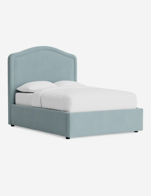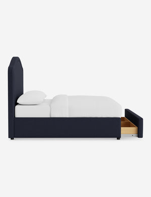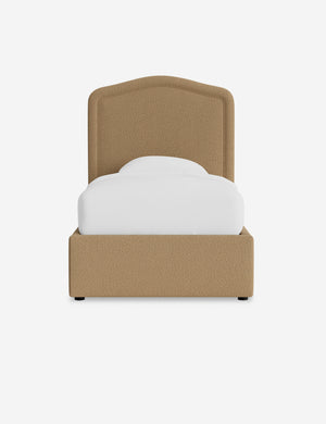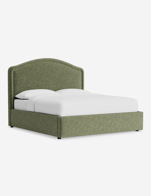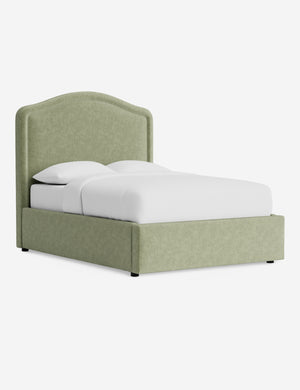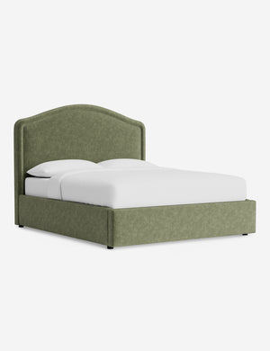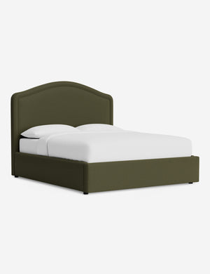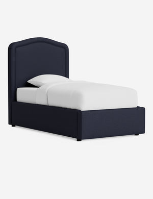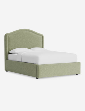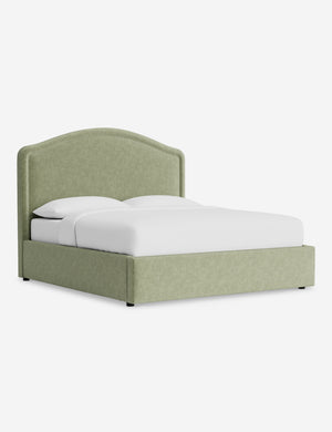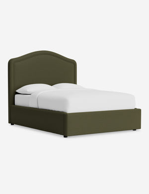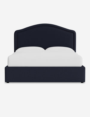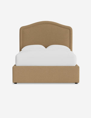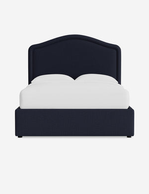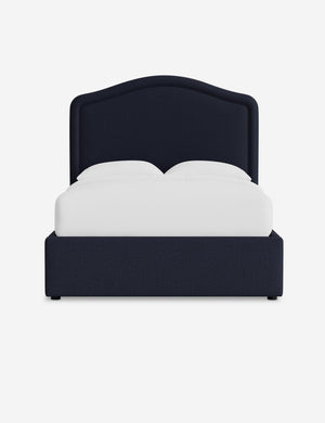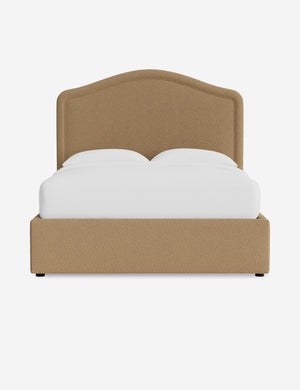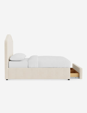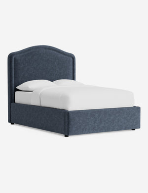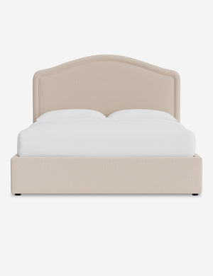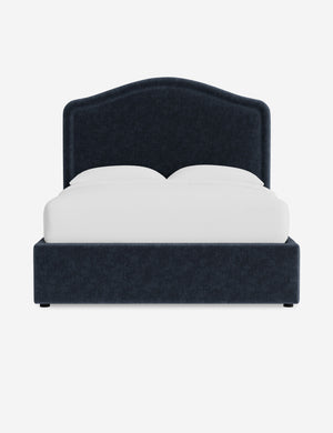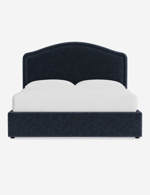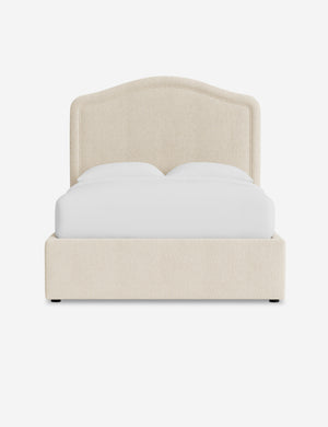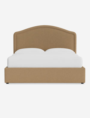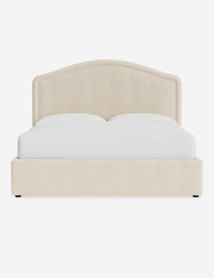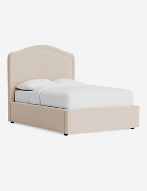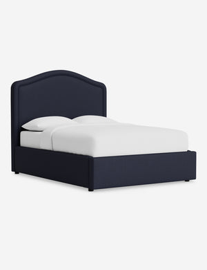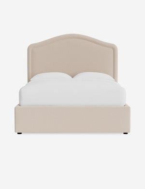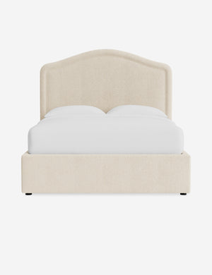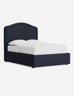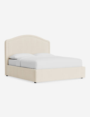 The Hollins bed features a graceful arch in a clean, tailored frame. The fully upholstered headboard brings shape and comfort to the design, set on tapered wood legs for an airy lift. Built-in storage preserves the refined look while offering discreet, everyday organization.