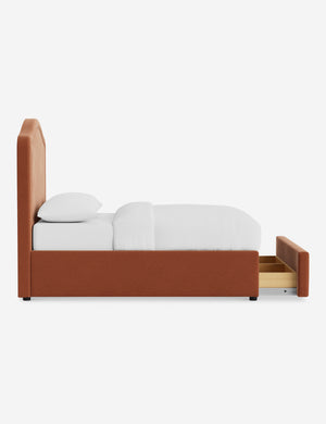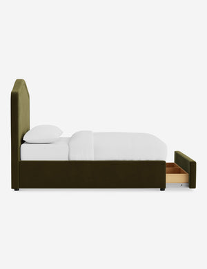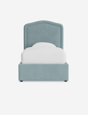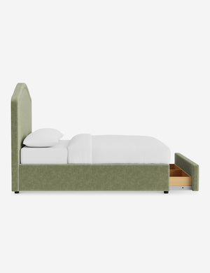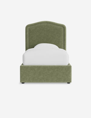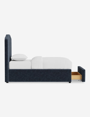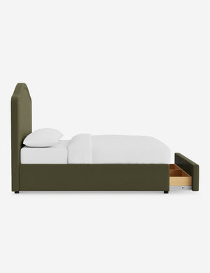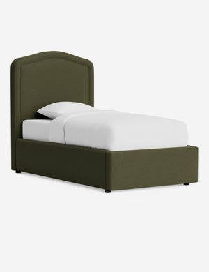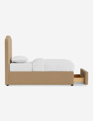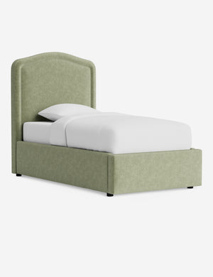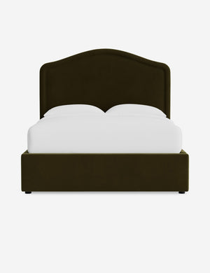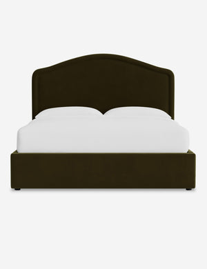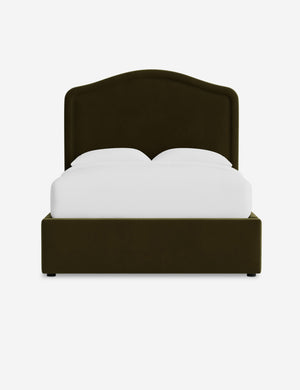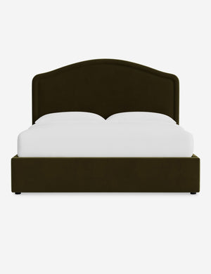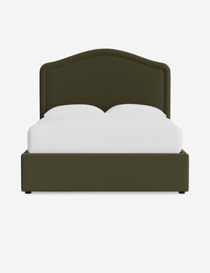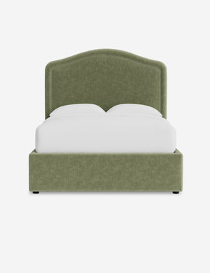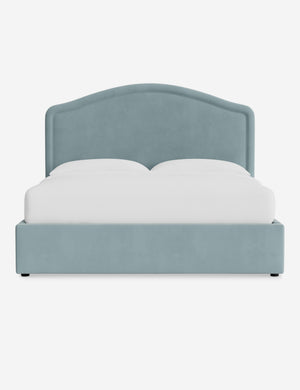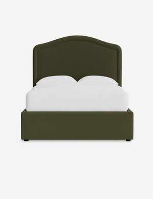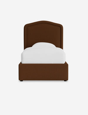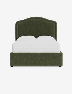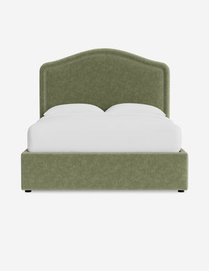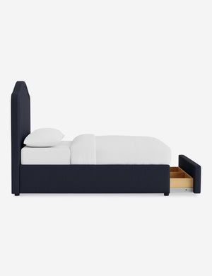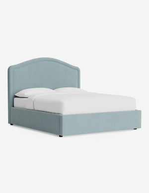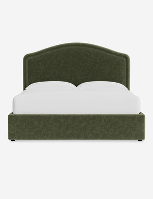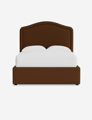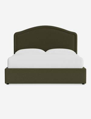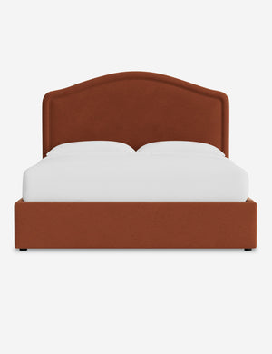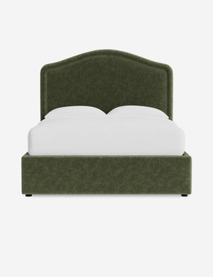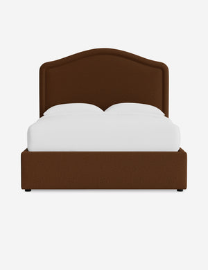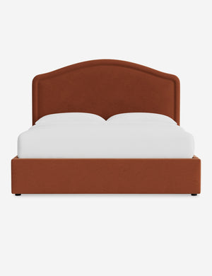 The Hollins bed features a graceful arch in a clean, tailored frame. The fully upholstered headboard brings shape and comfort to the design, set on tapered wood legs for an airy lift. Built-in storage preserves the refined look while offering discreet, everyday organization.