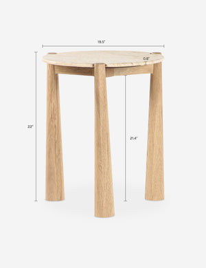 Three tapered oak legs define this small side table's chic silhouette, featuring a round travertine top for that grounding touch of stone beside your seat. It's the perfect end table for a space where natural elements and textures set off an artfully modern edit.