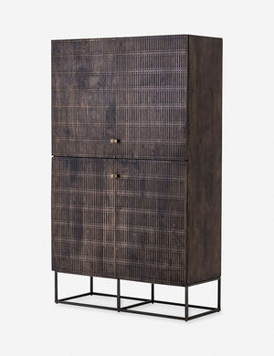 A carved geometric pattern takes this cabinet from piece of furniture to work of art. The richly-hued stain showcases the intricate work and a caged metal base keeps the piece from feeling too heavy. Pair with a Moroccan-style rug for a eclectic and global look.