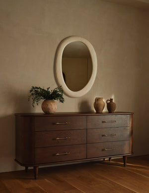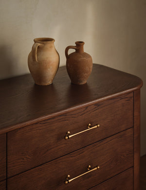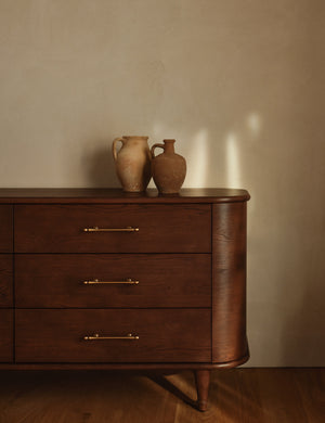 Sleek lines and a rich finish make the Jonathan dresser a timeless anchor for your bedroom layout. The gently rounded case sits on turned legs, featuring six soft-close drawers with elongated brass pulls for a tailored touch. This piece blends function with sophistication, folding ample storage into the texture of your design.
