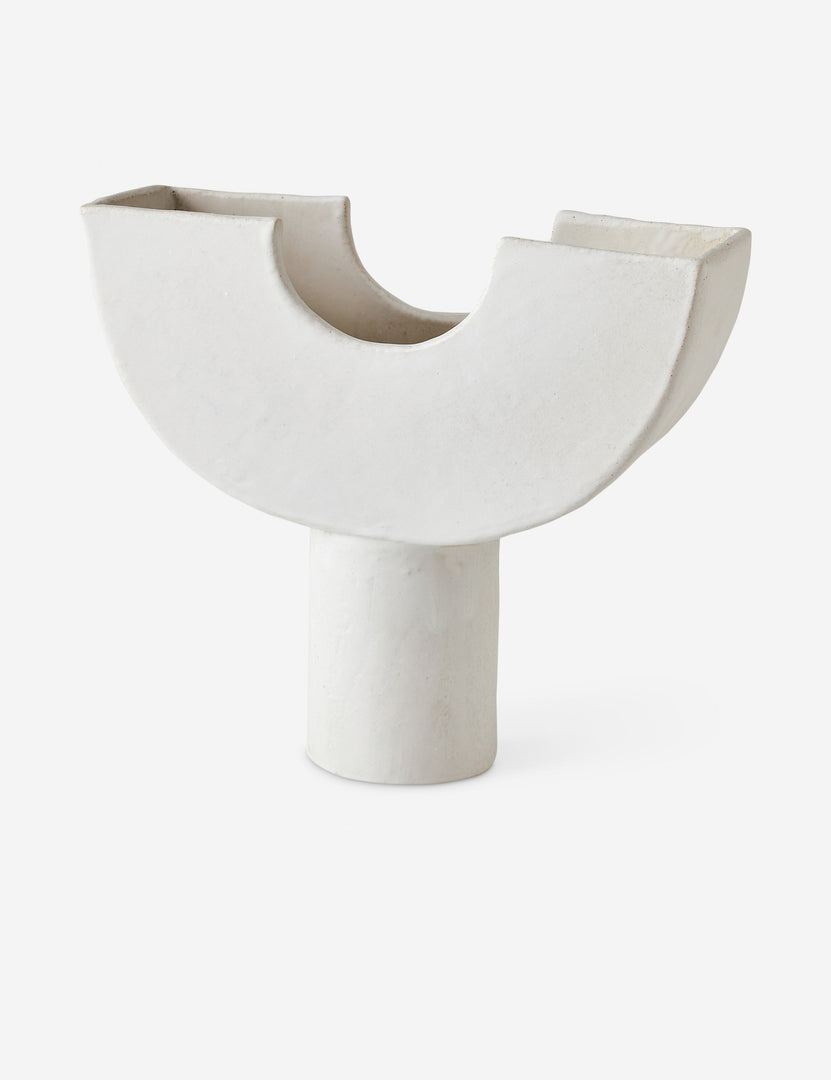 This sculptural ceramic bowl features a bold arched form and a hand-applied white glaze for artisan texture with a modern edge. Its inverted shape adds a striking focal point to any tabletop or display.