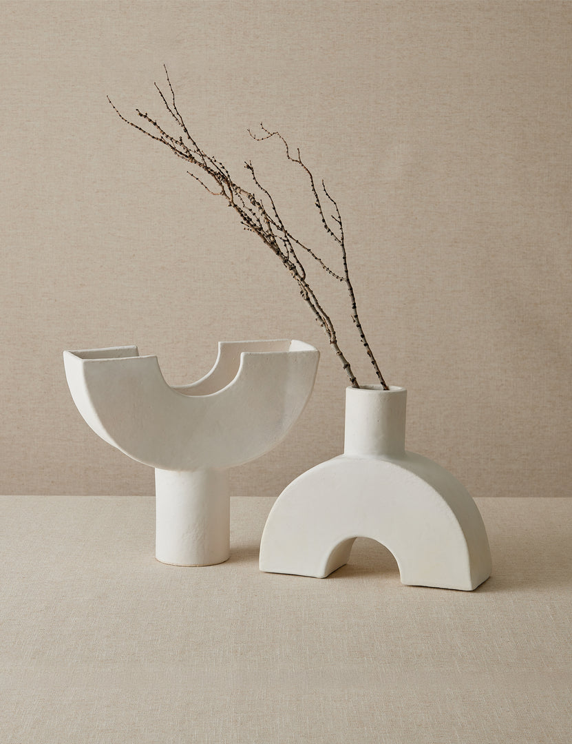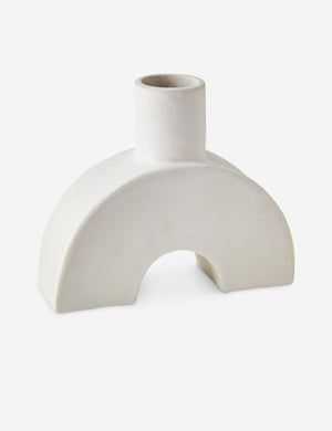 This sculptural ceramic vase features a bold arched form and a hand-applied white glaze for artisan texture with a modern edge. Style it on a shelf or console to bring in subtle architectural interest.