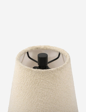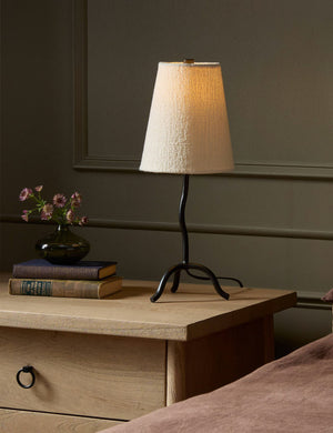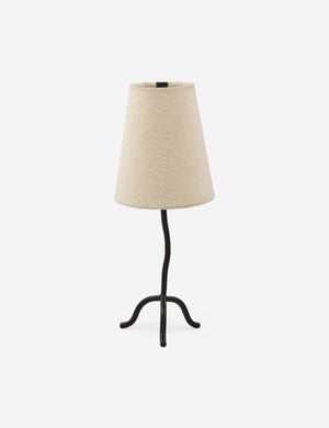 Justino is a cast-iron tripod lamp with a design-forward character. Wavy lines and a boucle shade create a chic, compact silhouette, perfect for styling on a desk, console, or bedside table.
