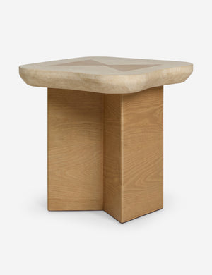 The Kanto side table plays with modern form and material contrast. A boxy wood base reveals beautiful grain beneath a travertine-style top, where organic edges and an inlay add texture and warmth. This small side table is from our exclusive Sarah Sherman Samuel collaboration and features all the trademarks of her warm, edited style.