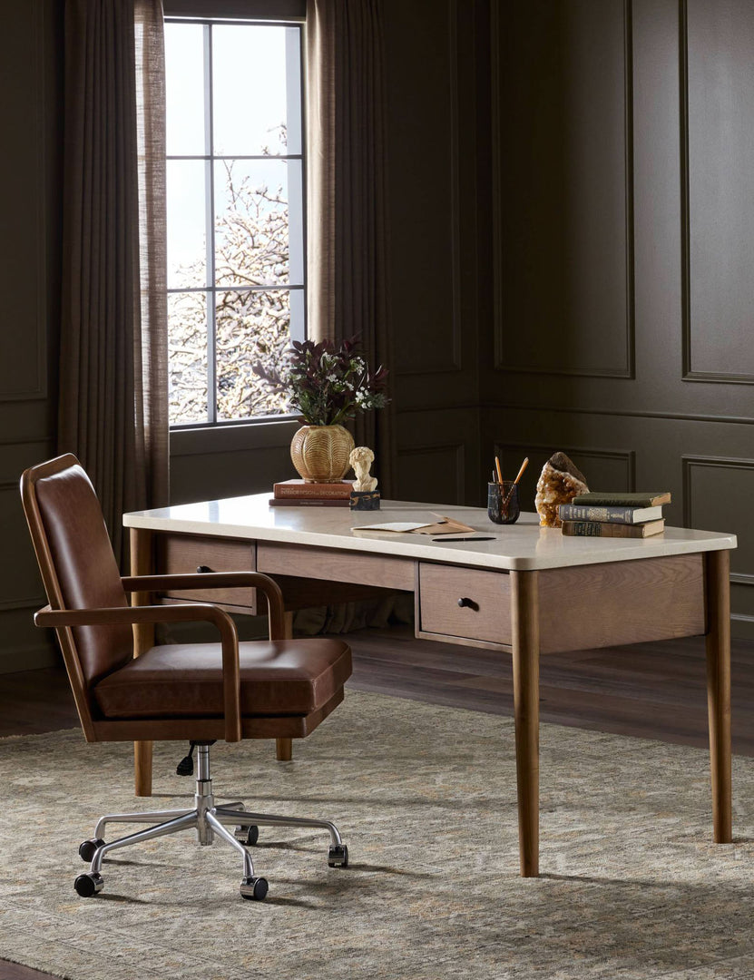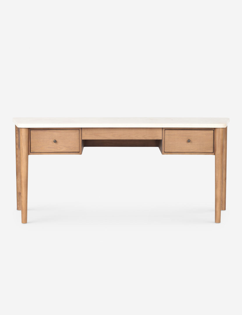 The Keegan desk sets a light tone for your workspace with its cream marble top and amber ash frame. The tapered legs and three drawers fashion an airy silhouette with a striking balance of function and form, perfect for a curated office or bedroom corner.