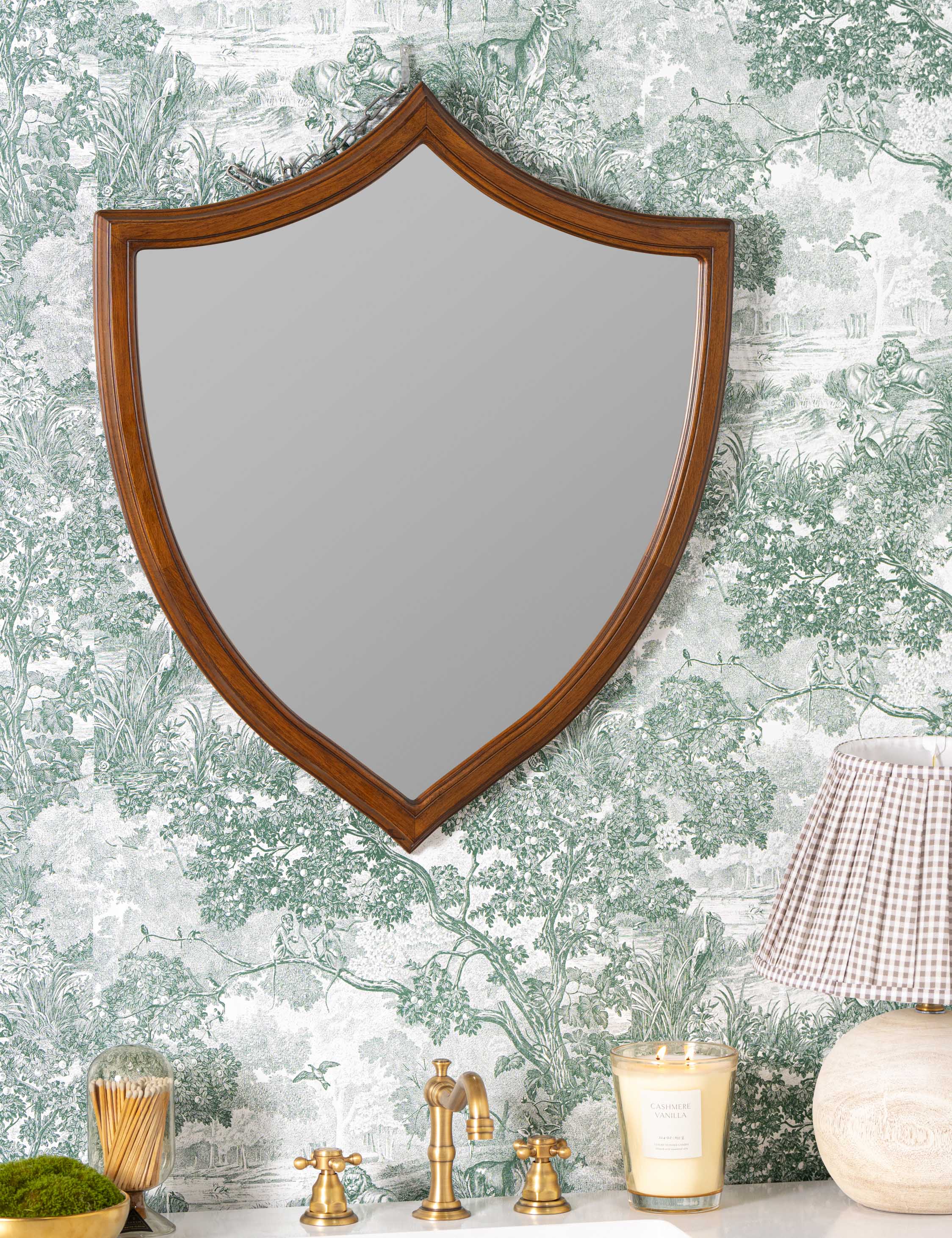 Classically drawn with a whimsical edge, the Kierse mirror brings a fresh take to traditional form. Its shield-like frame nods to vintage design with a warm mahogany finish, adding a clean-lined shape and a moment of depth to any wall.