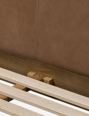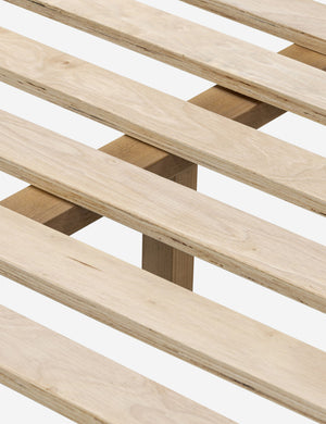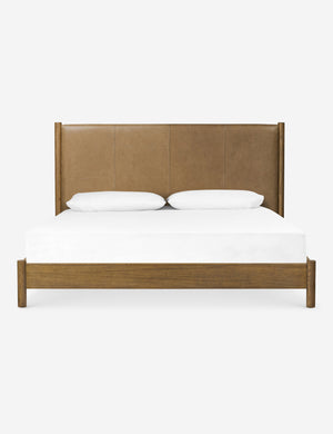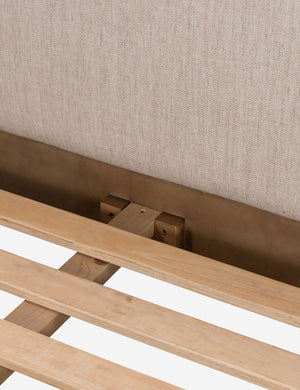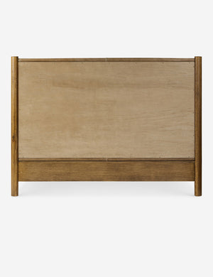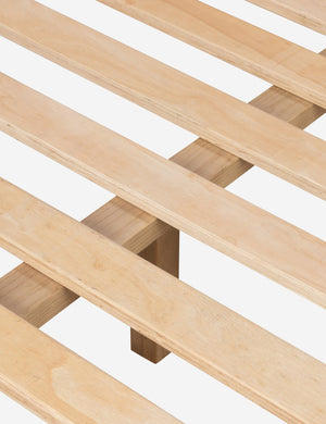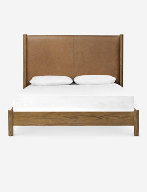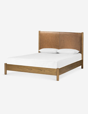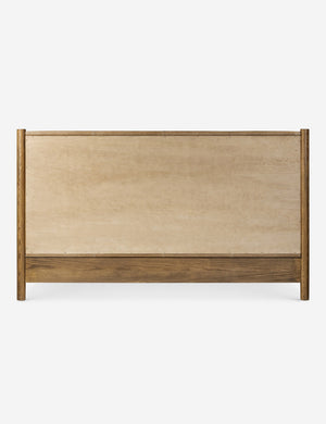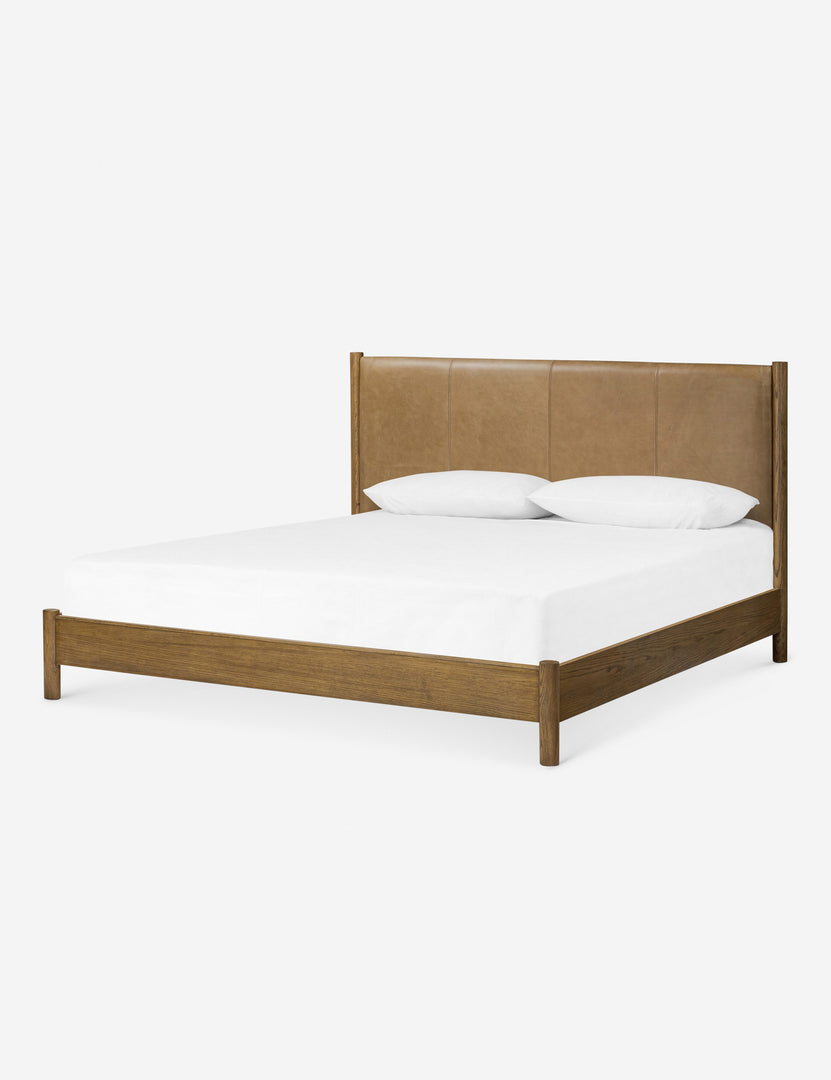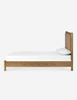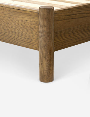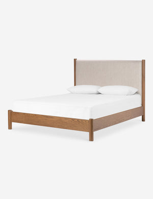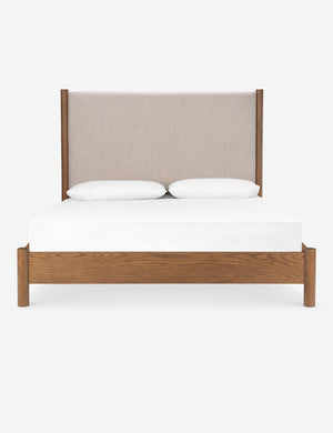 The Kisner bed brings transitional appeal to oak. Rounded legs hold a clean-lined frame in a warm finish that showcases the natural grain. With its trimly upholstered headboard, this platform bed offers a grounding centerpiece for a timeless bedroom curation.