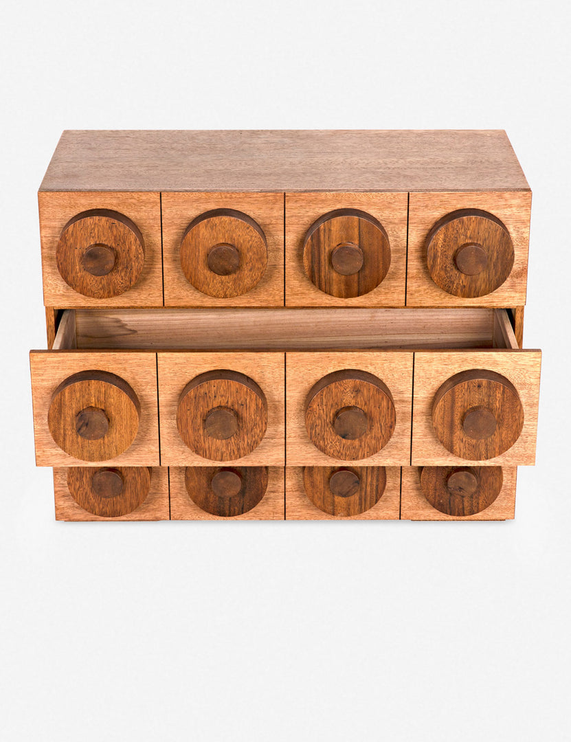 Cylindrical wood drawer pulls clad this dresser with a playful facade for an effortlessly modern feel. We love the compact length and spacious drawers for an eye-catching dresser with small-space potential.