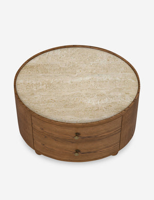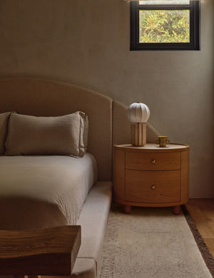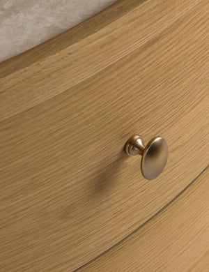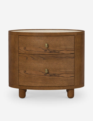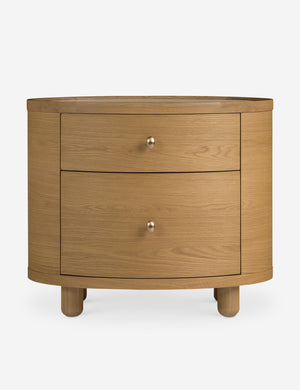 The Laguna side table features a clean-lined oval case on bun feet for understated impact in oak. Round pulls and soft-close drawers elevate the look with a seamless touch. Style this piece as an end table beside a sofa or use a pair as nightstands for bedside balance.