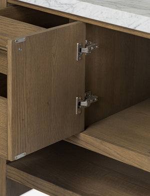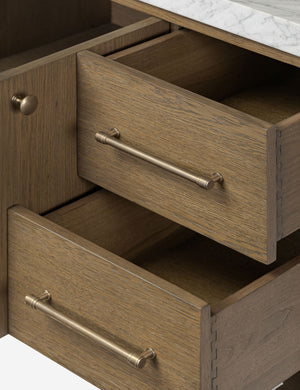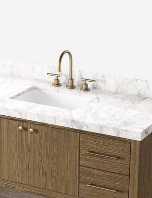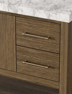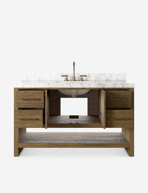 Looking for a total bathroom refresh? Make it new with the Laurenson vanity. The Carrara marble top and solid brass hardware offer a touch of luxury against the wire-brushed grain of the oak-clad frame. Its clean-lined design offers spacious storage with a mix of drawers, cabinets, and open shelving for every amenity imaginable.