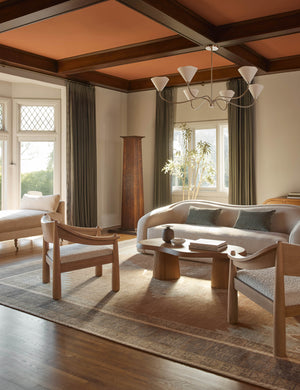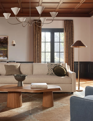 With slender lines and subtle floral form, our Loana chandelier is poised for effortless sophistication. This large chandelier features six curvilinear arms to create a brilliant pool of ambient light overhead. The brass finish and linen shades set the tone for warmth and elegance.