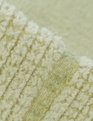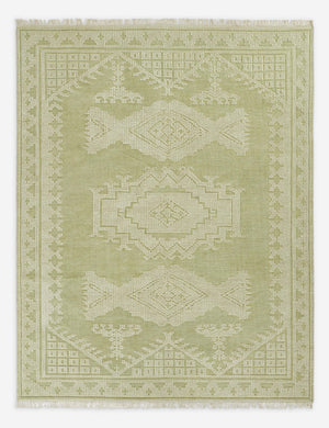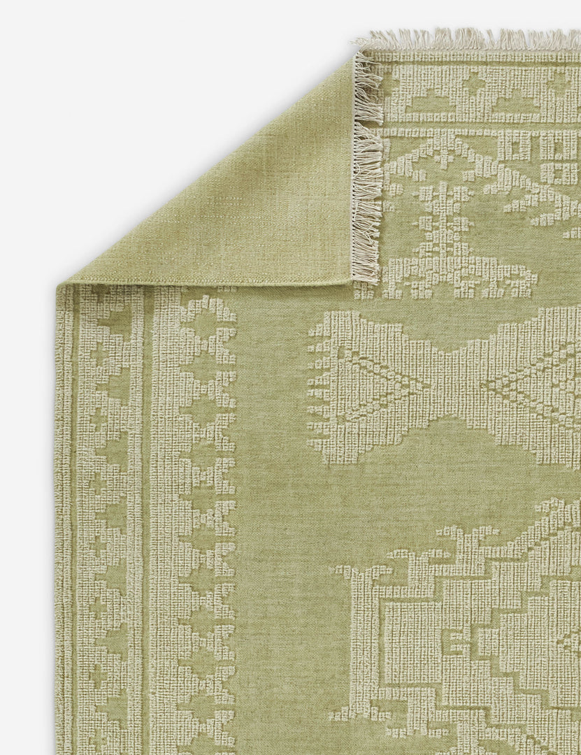 The Lulit rug offers a fresh take on traditional designs. This handwoven rug features pared-back motifs in a muted, earthy green for a grounding touch of color. The flat woolen weave is ideal for a dining area or high-traffic living space.