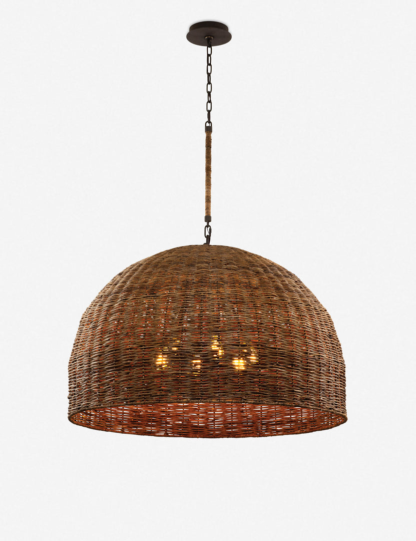 A basket woven shade brings fresh texture with a laid-back air to the Macias chandelier. This hanging wicker light fixture can offer a warm rustic feature over a dining room table or signature piece in a thoughtfully collected lounge.
