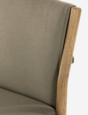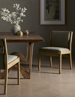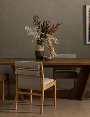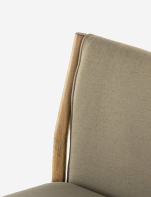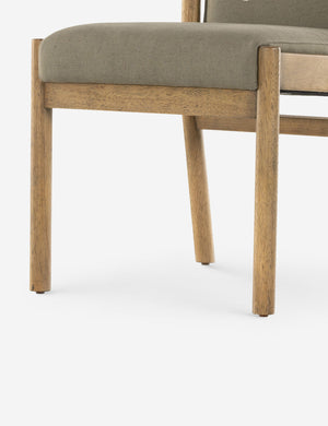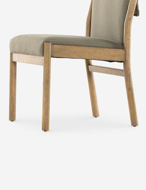 Macklin offers a stylish dining chair made for practical appeal. Textural earth tone upholstery is folded over the light wood frame offering a comfortable dining seat with versatile styling potential. The performance fabric is ideal for withstanding spills and stains in an everyday dining space.