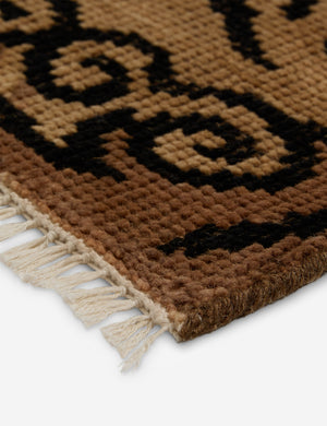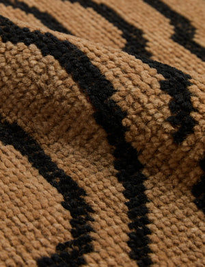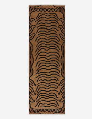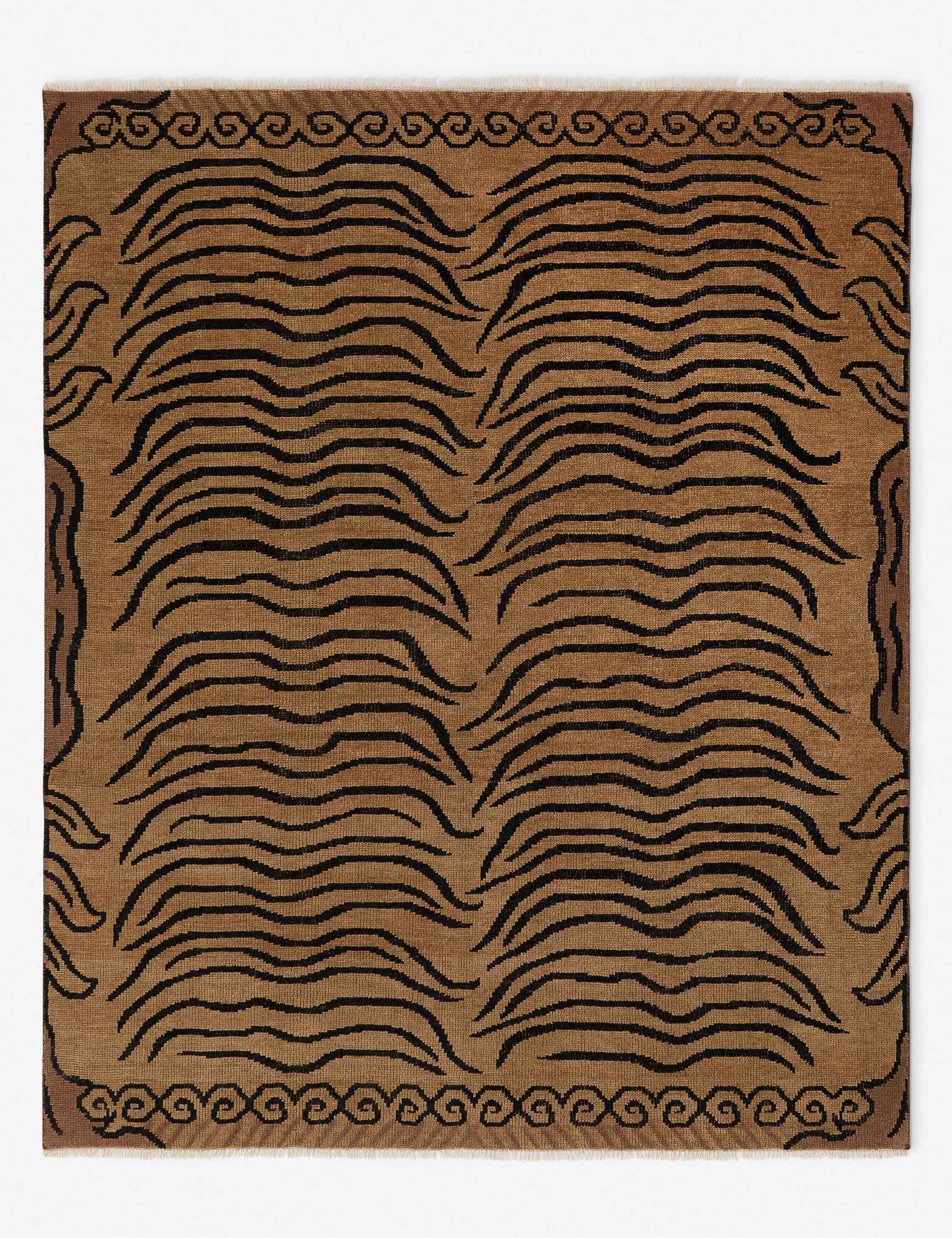 The Makeda rug brings bold pattern into focus with a nod to classic tiger motifs. The hand-knotted design features flowing stripes and a framed border, rooted in natural fiber texture. Style this wool rug in a living room, library, or bedroom for a look that layers sophistication with a strong tread underfoot.