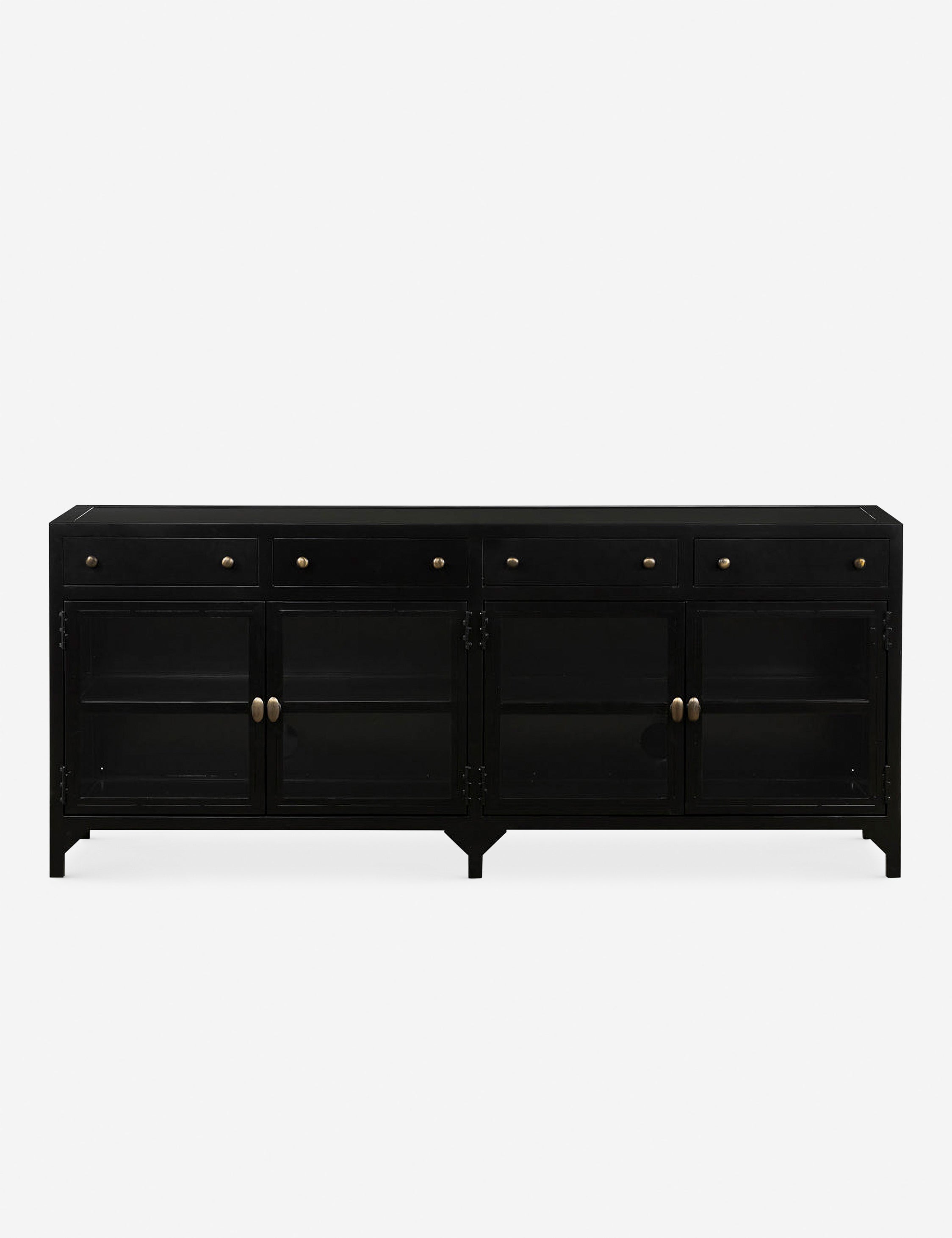 In a sleek nod to a shadow box design, this console table features an iron frame with glass doors for storage and display. The Malcom Media Console offers four drawers, spacious shelving, and rear cutouts for a clean look with an industrial edge.