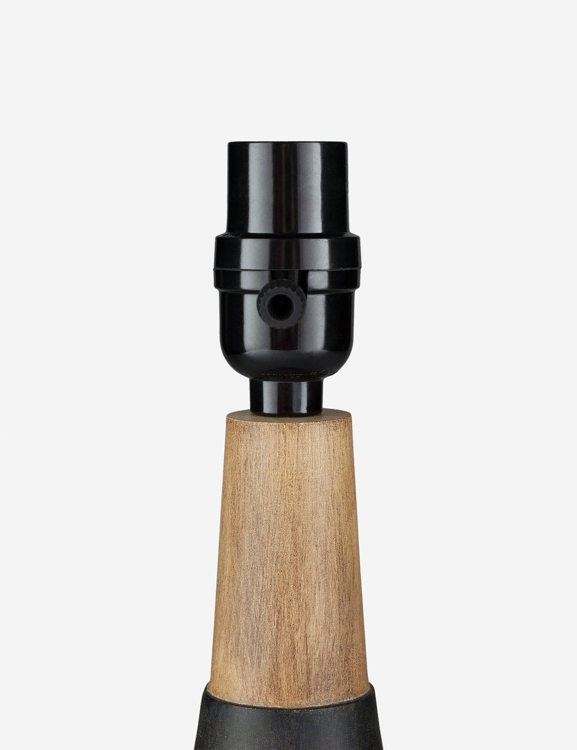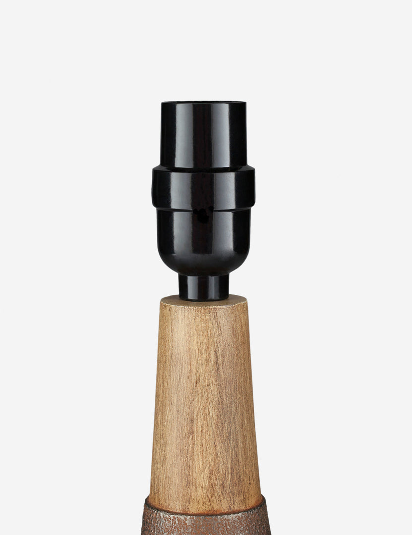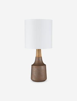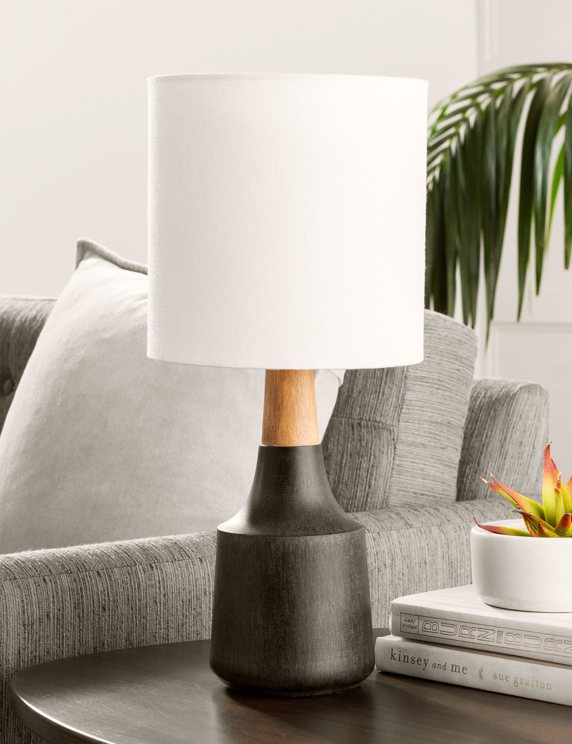 Inspired by traditional pottery, this stylish table lamp resembles an antique vase fitted with a wooden neck and linen shade. With its angular curves and textural finish, this lamp offers an eye-catching addition to transitional or modern decor.