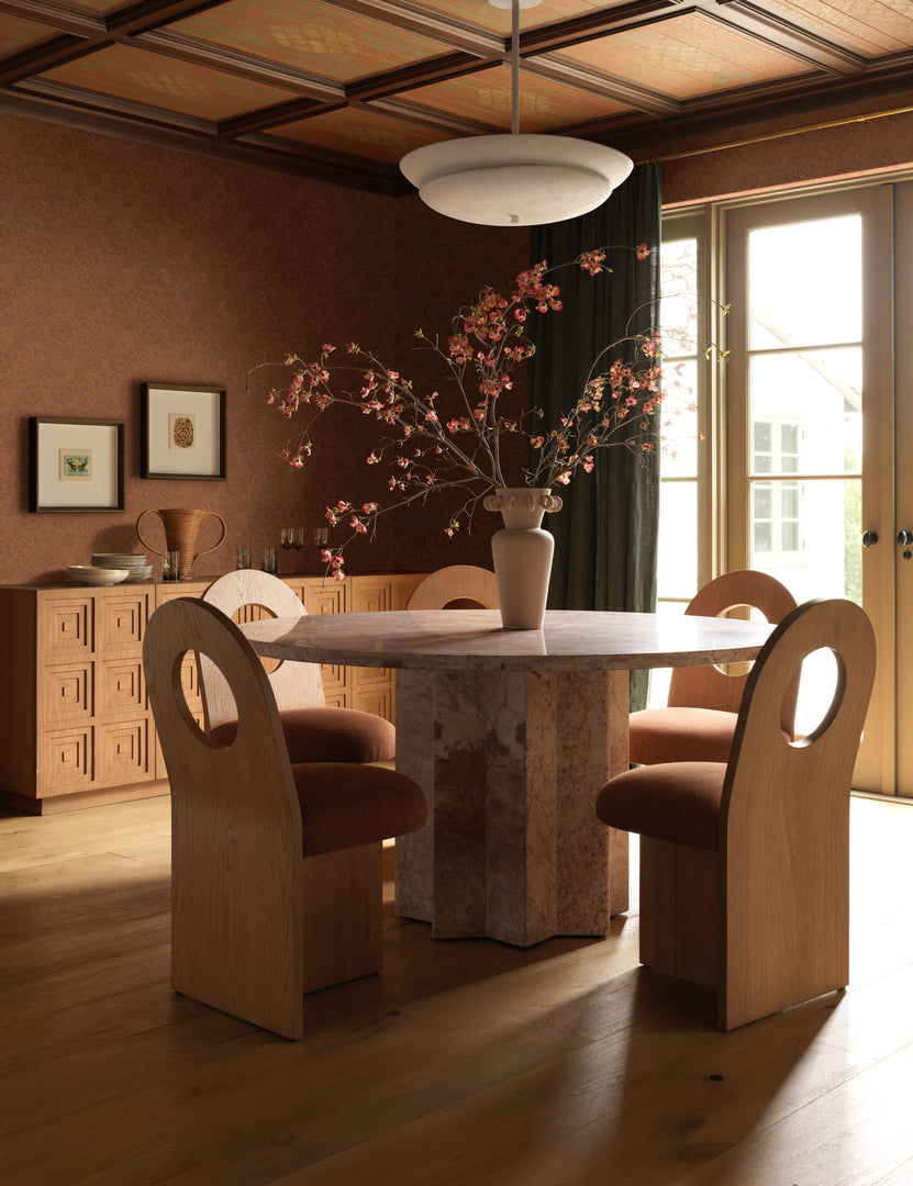 A bold profile cut from marble makes this table an instant focal point. An angular pedestal base supports the round top, shaping a silhouette that feels both grounded and refined. The result is a dining table that imbues sophistication through its striking form and rich mineral tones.