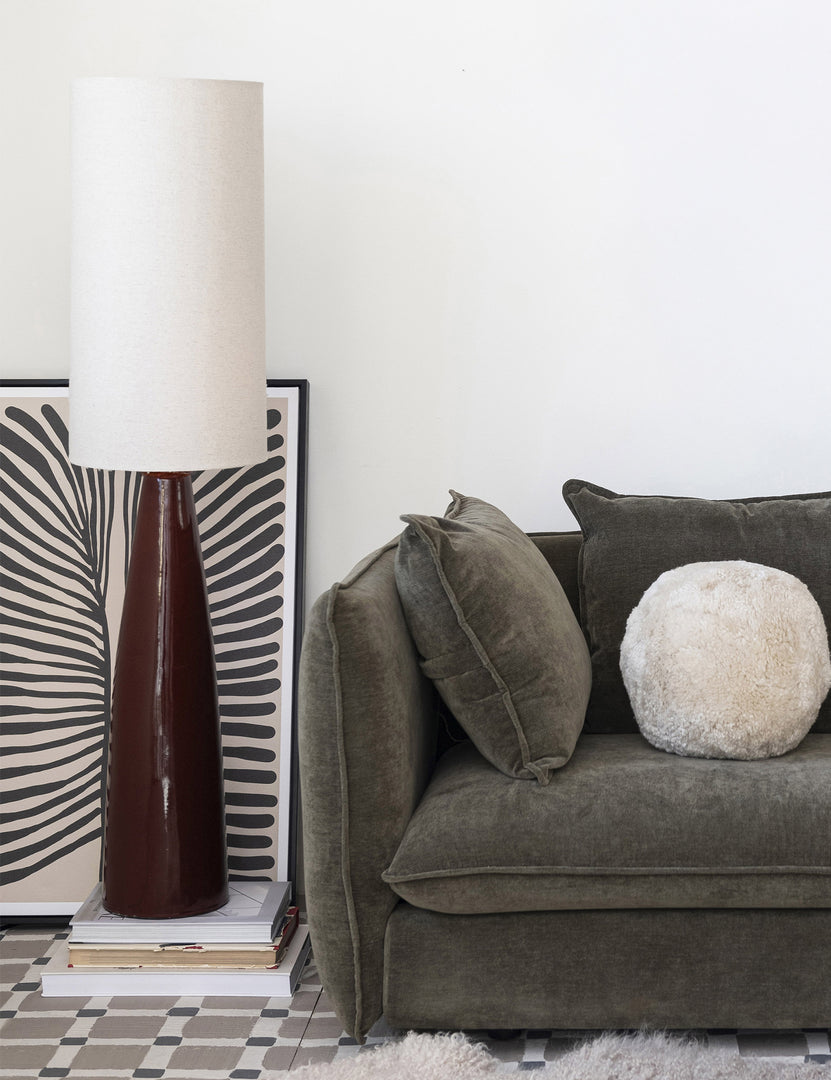 Bring a sculptural edge to your lighting design. The Marise floor lamp features a tapered base in a sleek reactive glaze for a bold splash of color in your design. The tall linen shade filters light for a warm, diffused glow.