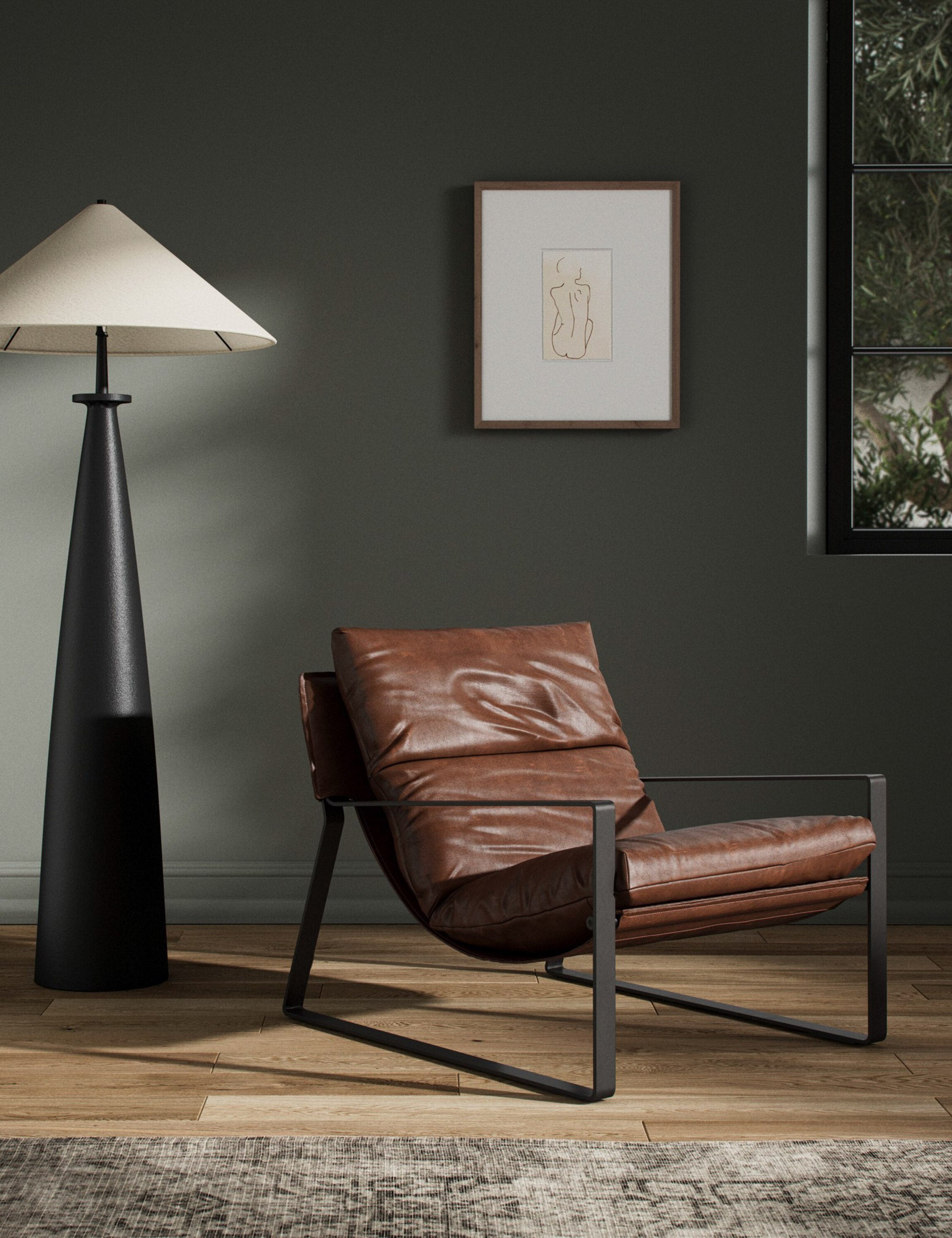 Meet your new favorite lounge chair. This sling chair features top-grain leather in a rich tobacco color, complete with a black metal frame for a quintessential mid-century look.