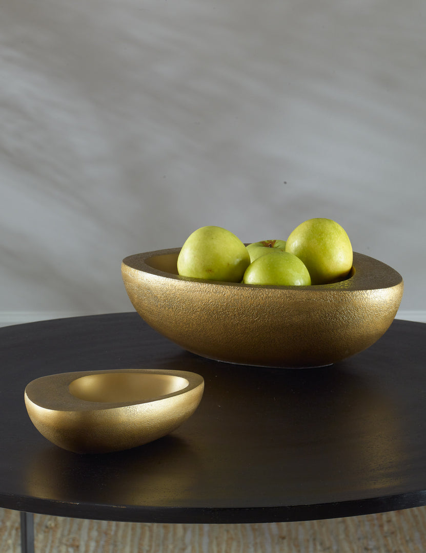 An antique brass finish highlights these sculptural bowls with warmth and elegance. Together or apart, they're a striking choice for any tabletop, creating a chic spot to display peel-on fruit or a selection of decor.