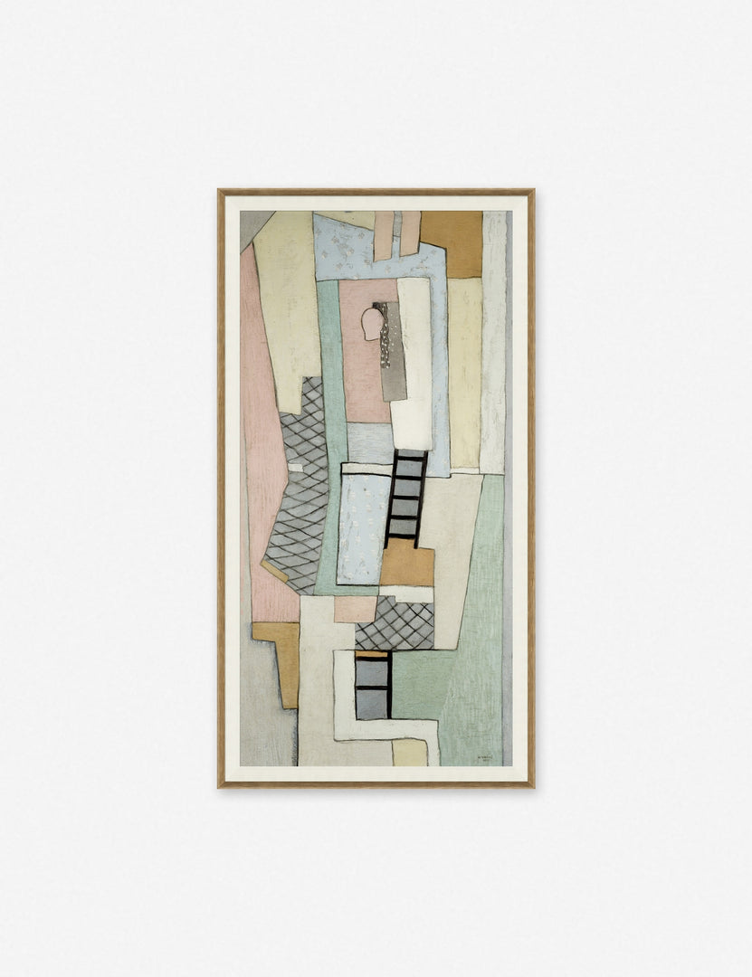Muted tones and geometric shapes are the stars of this cubist-inspired wall decor piece. The framed wall art print offers a versatile abstract look that's perfect for light and bright modern homes.