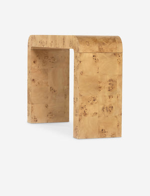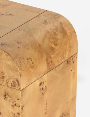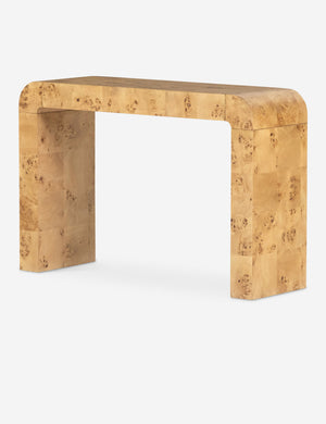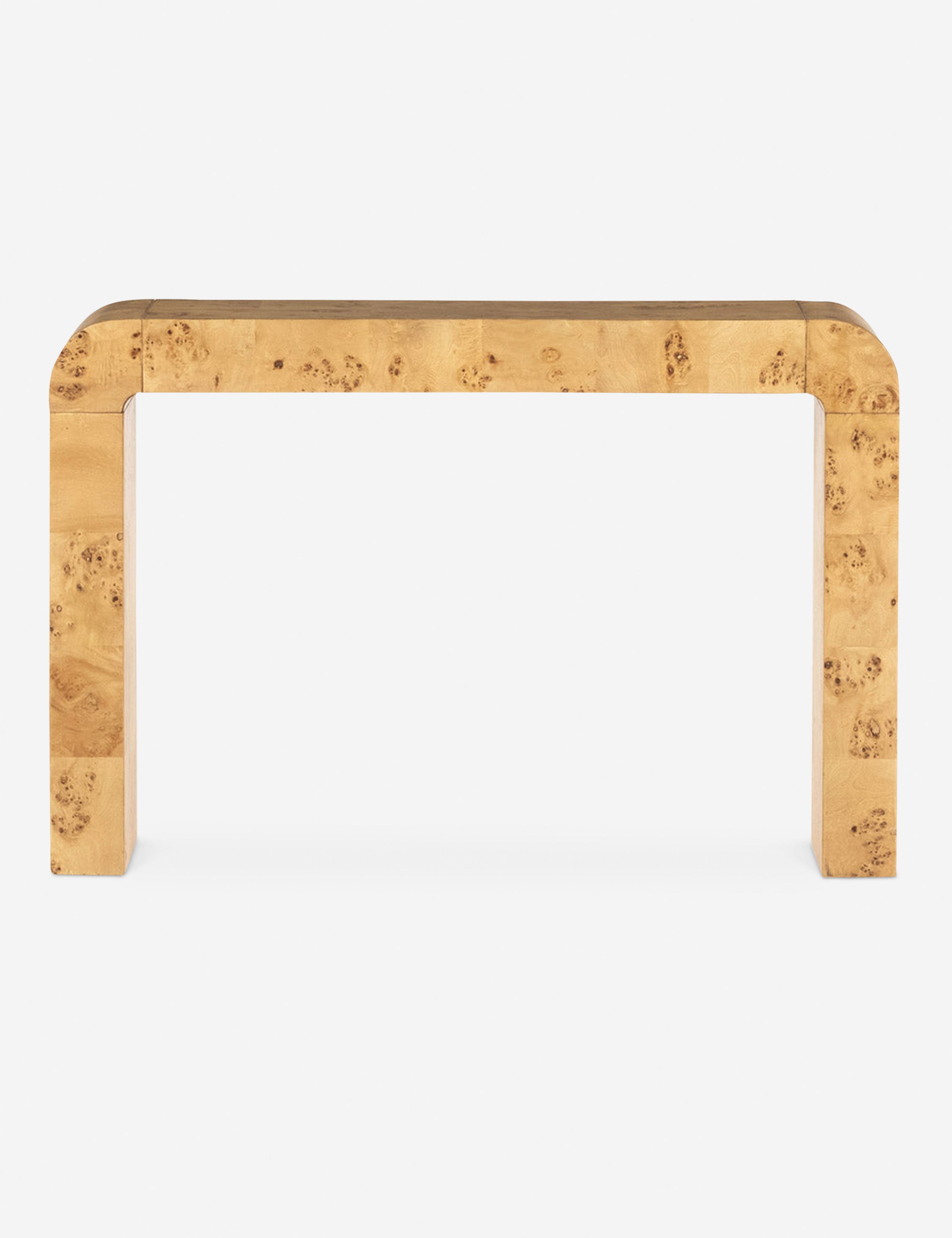 Clad in a patchwork burl wood veneer, this sleek console table offers your space a signature look. The curving waterfall design features a high polish finish highlighting its luxe natural grain. We love the warm elevating tone for a grand, statement-making entryway table.