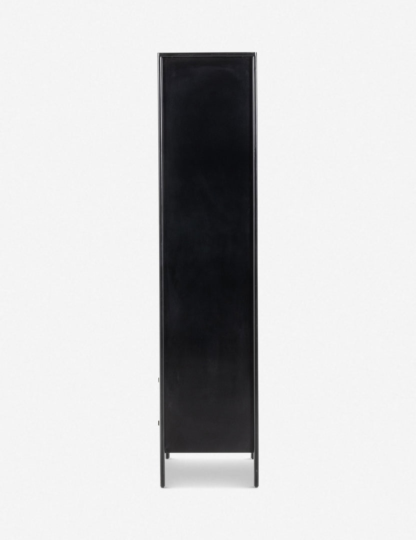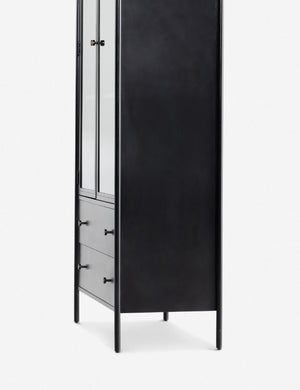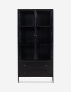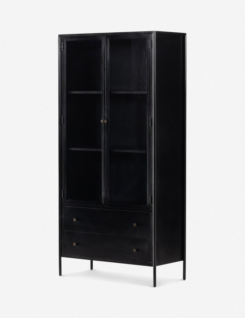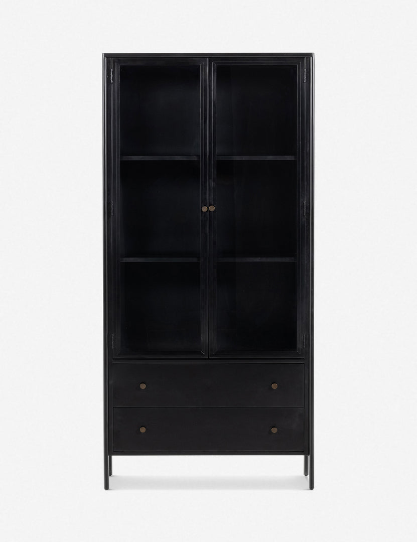 Blending sleek style with industrial undertones, this black-finished iron cabinet casts a polished silhouette with bronzed hardware for modern appeal. Glass doors and two drawers offer endless options for storage and display in this curio cabinet design.