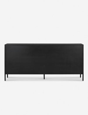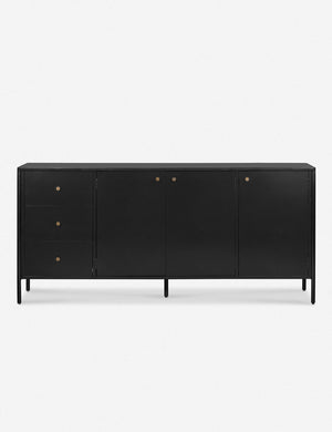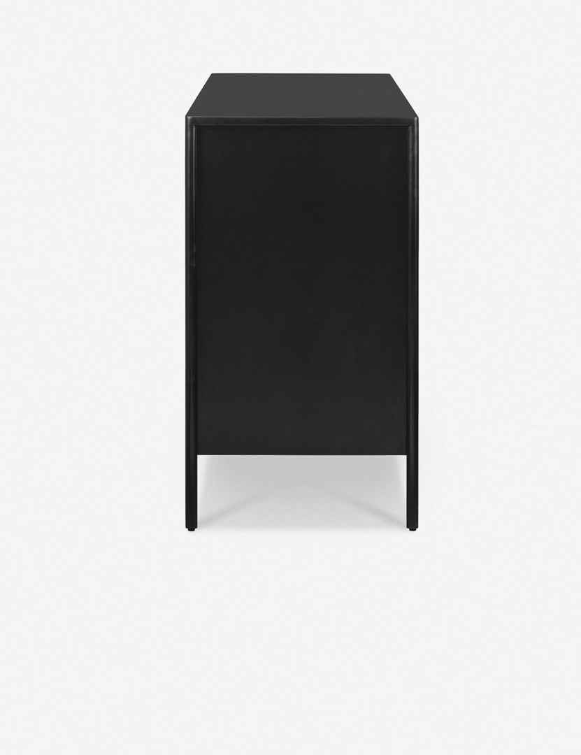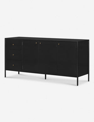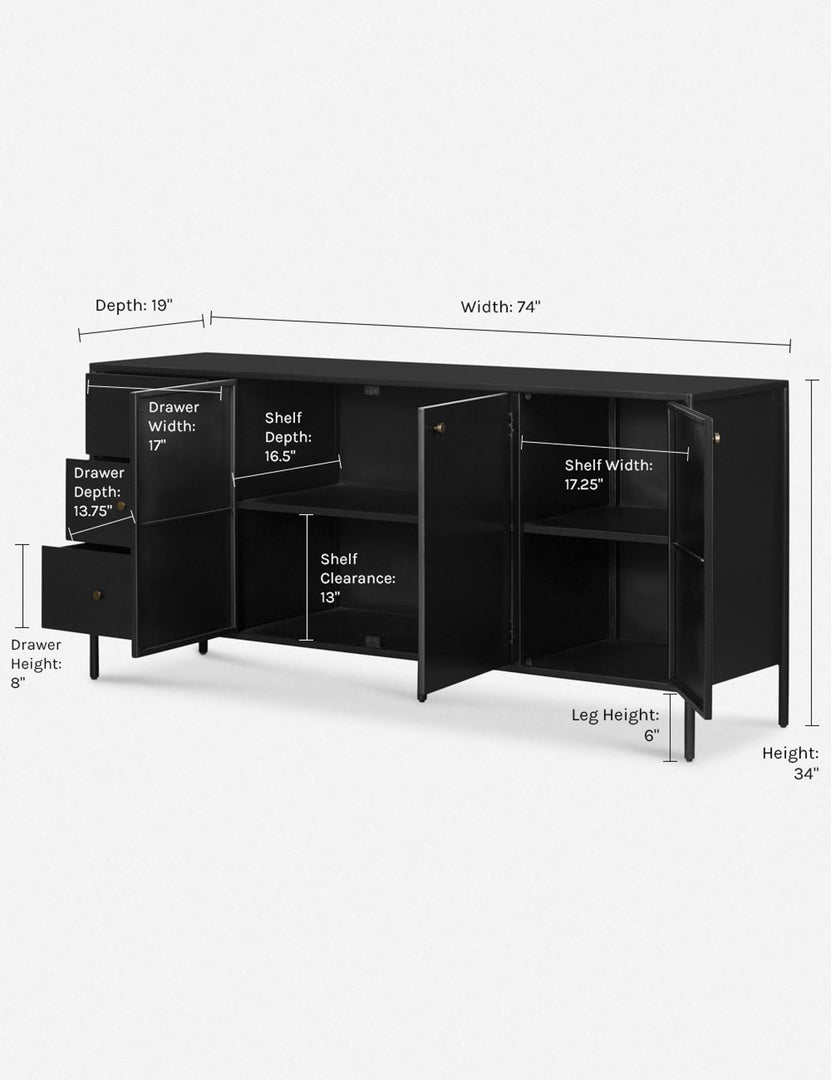 Blending sleek style with industrial undertones, this black-finished iron sideboard cabinet casts a clean, spare silhouette with bronzed hardware for modern appeal. Three drawers and two spacious cabinets offer versatile storage, whether styled in a living room or as a dining room buffet.