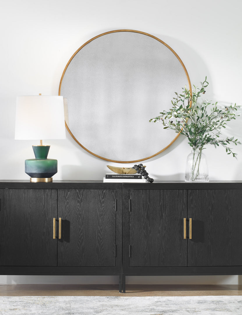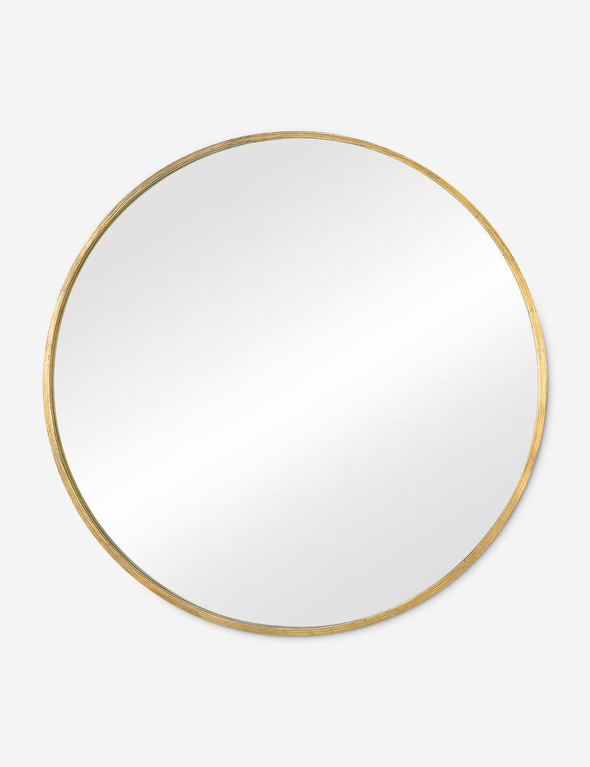 Bring some patina to your curation with the Maurice mirror. Its sleek round silhouette features a slim frame in an antiqued gold leaf finish that sets off its seasoned look. This decorative wall mirror sets a timeless tone for surrounding decor.