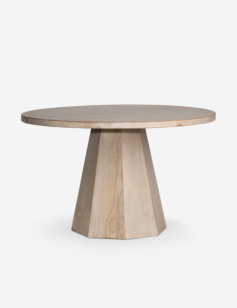 Beautiful cuts of reclaimed pine clad in a light wash finish inspire a soft, natural appeal in the Mays dining table. The hexagonal pedestal brings a modern edge to the minimalist design. This round table is ideal for a breakfast nook or small-space dining.