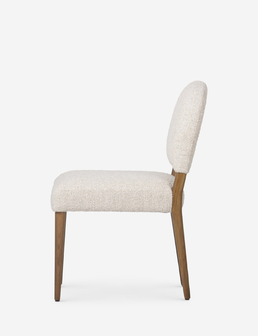 With its arched backrest and textural performance upholstery, this dining chair styles a plushly tailored look. The open-back silhouette adds a lightness that contrasts its generous padding, all grounded by a warm oak frame—a versatile dining seat that brings comfort and polish to any table.