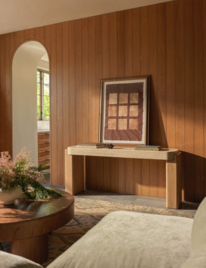 Our Midora console table sets the tone for understated impact. A slab of honed travertine rests atop softly sculpted wood legs, grounding the design with a modern edge. Rooted in natural materials, it makes a beautiful entryway table, bridging the shift from an organic environment to a curated interior.