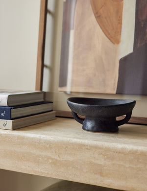 With its handled design and footed base, this stoneware bowl brings sculptural impact to any surface. The reactive glaze adds to its unique character—evoking a timeless quality. Fill this bowl with dried botanicals or aromatics to imbue your entryway or lounge with a warm, inviting touch that invites guests in.