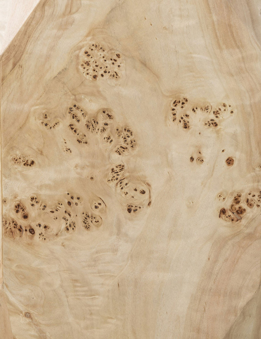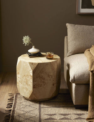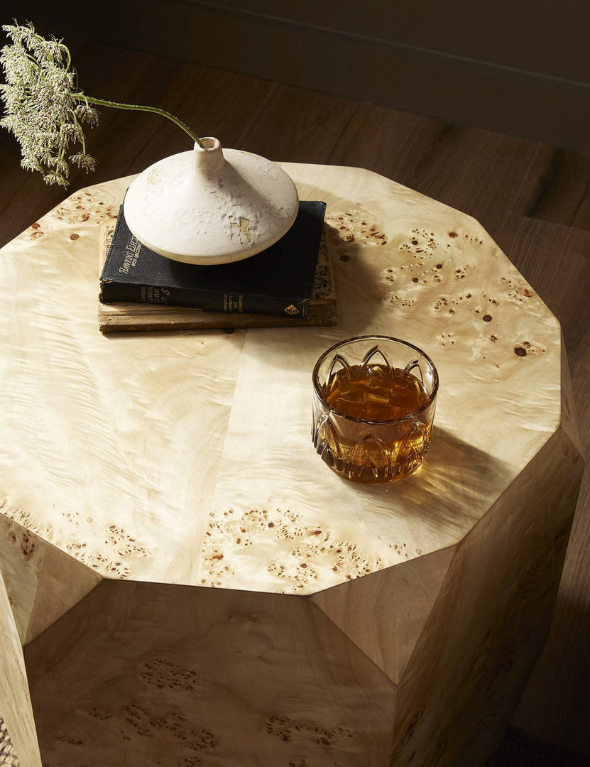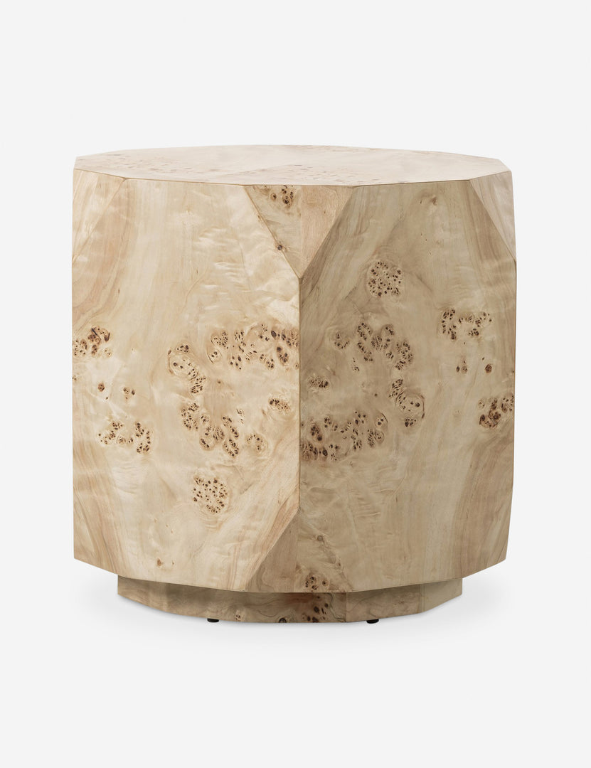 This burl wood side table brings sculptural impact with its bold form and rich natural patterning. The geometric silhouette is faceted to catch the light from every angle, while the swirling grain adds depth and visual texture. A striking accent piece, this end table finishes the room with organic polish and an artful edge.