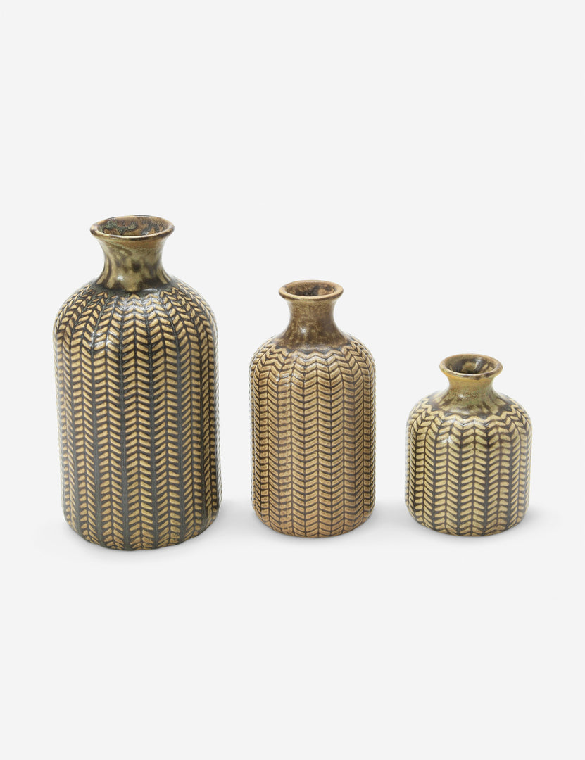 This trio of olive green stoneware vases features embossed textures and a matte reactive glaze for a rich, earthy feel. Group them on a mantel or use them to punctuate a shelf with color and artisan detail.