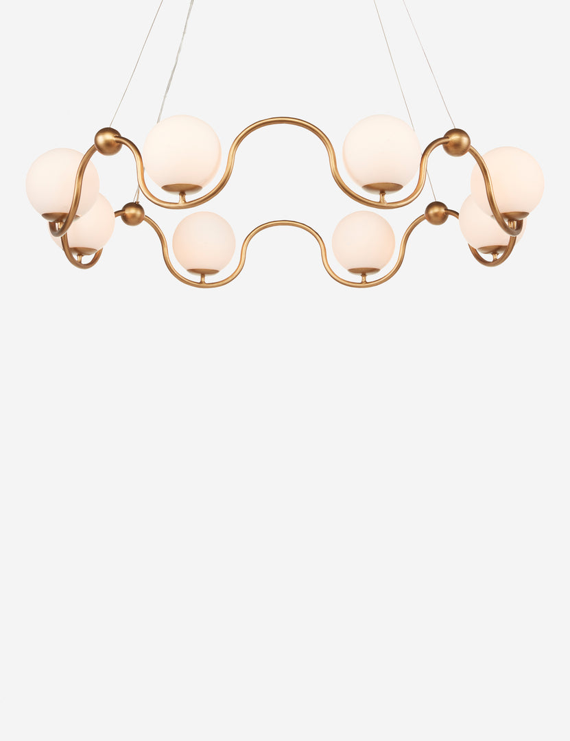 The Moreno chandelier offers balance and symmetry without a straight line in sight. This fresh take on the ring chandelier design is set for warmth and glamour overhead, with its wavy frame holding opaque glass globes in a stunning arrangement. The antique brass finish provides a polished touch, tying this statement piece to a timeless tradition.