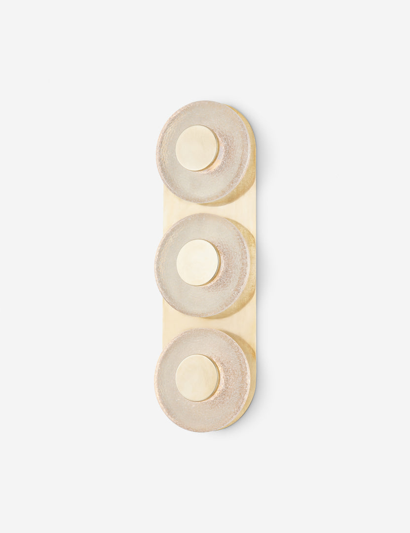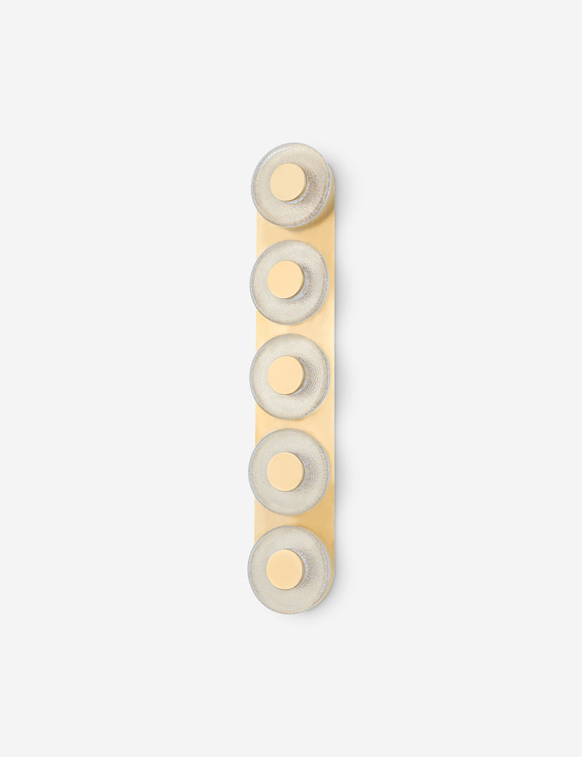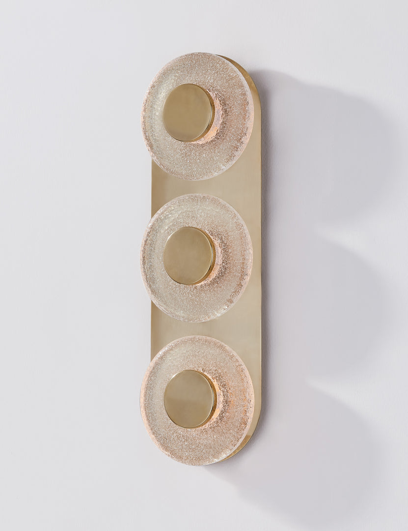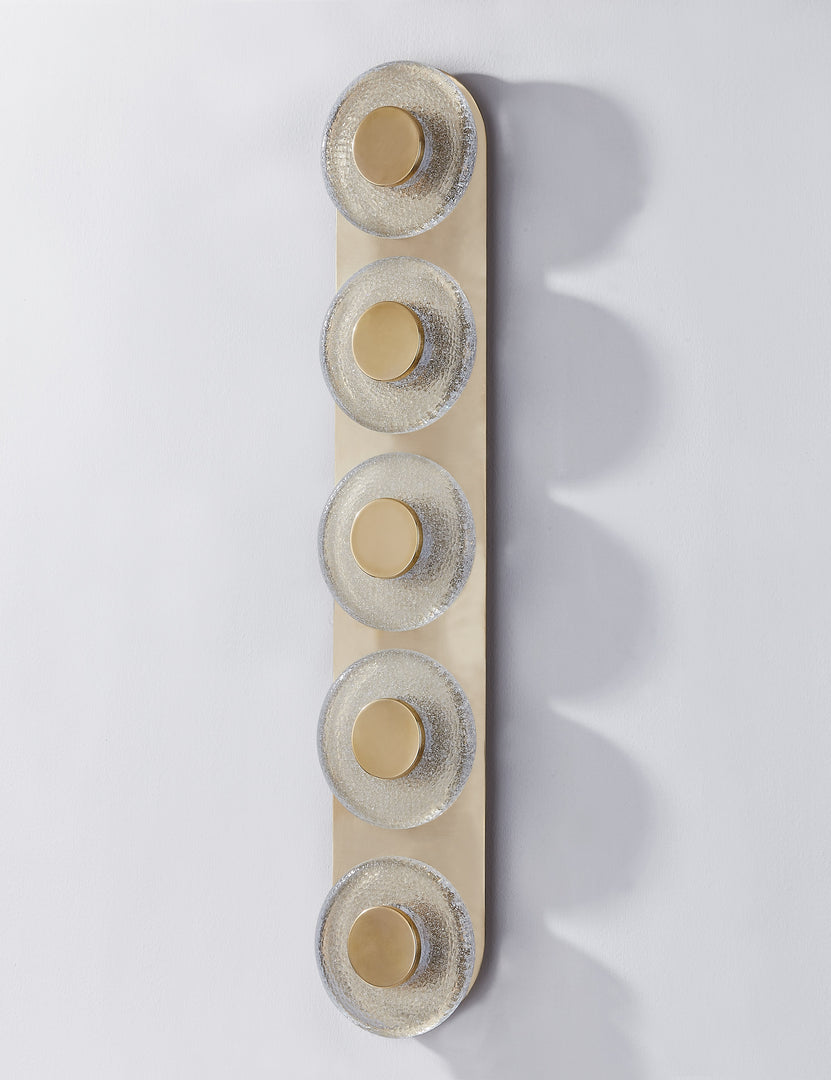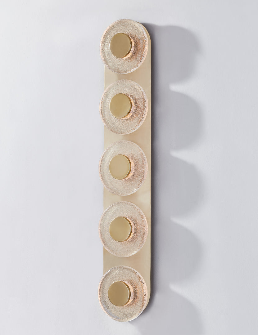 Who said simple can't be stunning? This slim sconce pairs thick circles of cast glass with metallic accents in a flawless design. When lit, the texture of this beautiful material is on full display, offering a dazzling wall sconce for transitional and modern aesthetics alike.